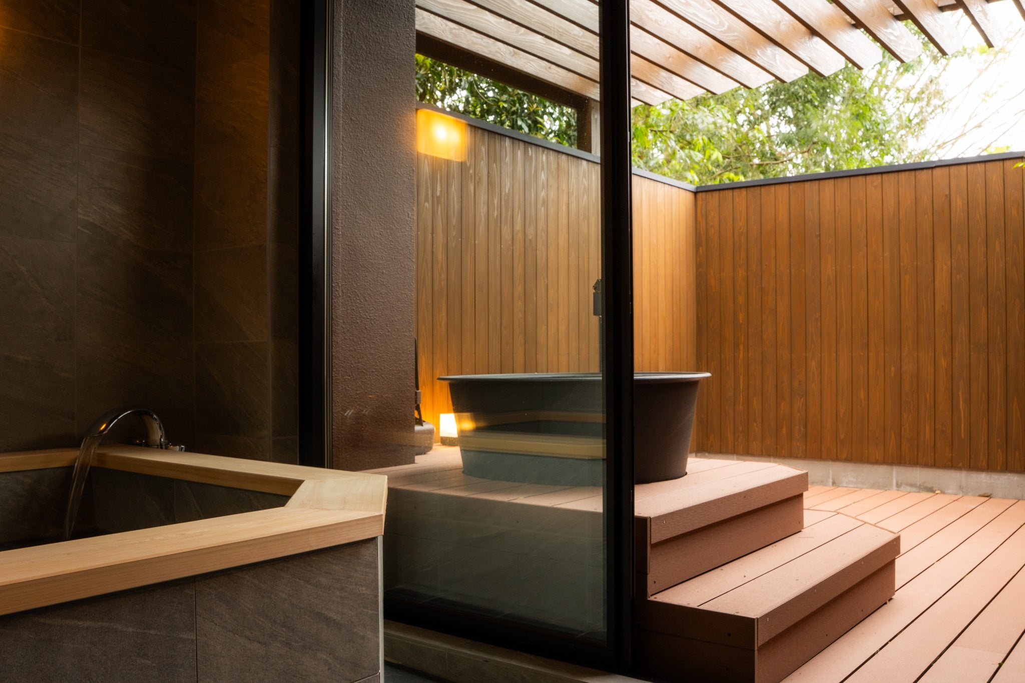 1階フロアは、庭とダイレクトにつながるサウナ付きスイートとして再構築されています。室内と屋外の境界を静かにほどきながら、大きな開口部からそのまま庭へと続く流れを設けることで、滞在のすべてが外の風景とゆるやかに連なっていきます。