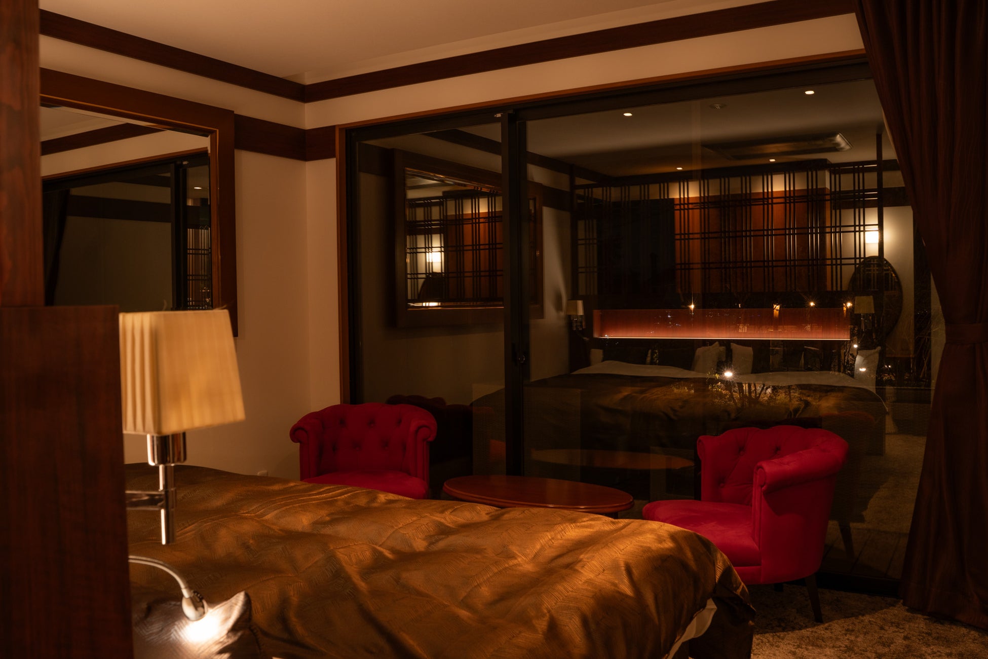 2階は、2室で構成されたフロアです。控えめに整えられた豊かさが落ち着きと共に静かに漂います。視線や気配はやわらかく整えられ、外へと向かいがちな意識をゆるやかに内側へと導きながら、滞在そのものを静かに深めていきます。余白を含んだ空間の構成が、時間の流れに自然な呼吸を与えます。窓の外に広がる西原村の風景は、距離を保ちながら静かに寄り添い、時間の流れを穏やかに感じさせる空間です。移ろう光や空気の気配とともに、その表情はゆるやかに変化し、ここで過ごす時間に穏やかな奥行きをもたらします。