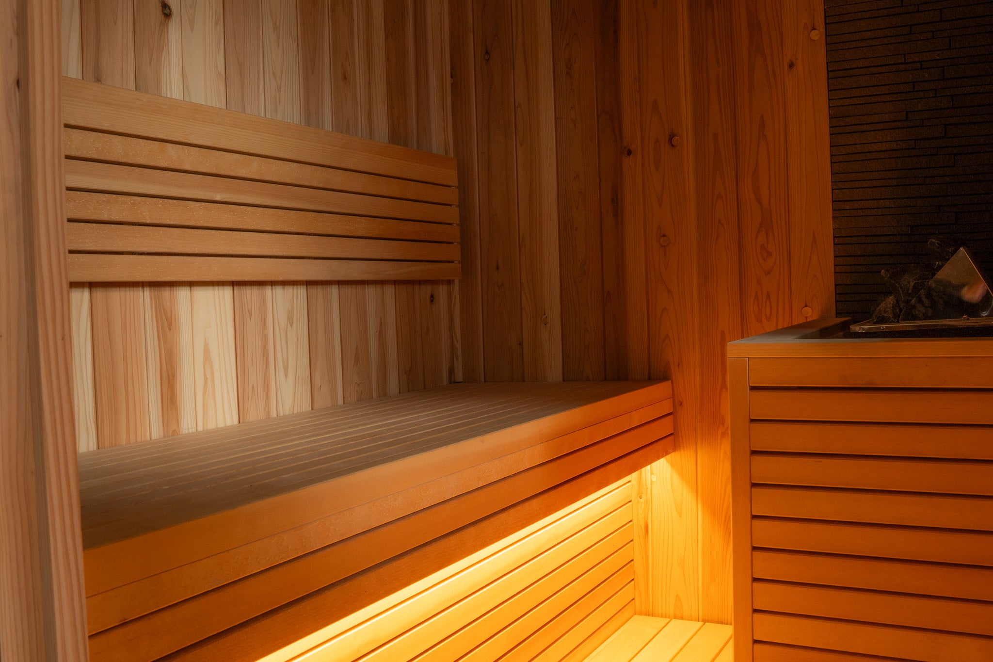 室内にはプライベートサウナを備え、熱と静けさに包まれる時間と、外の自然へと解放される時間が自然に行き来する構成となっています。窓の先に広がる庭は単なる景観ではなく、滞在の一部として機能し、朝の光、昼の風、夜の静けさがそのままひとときに重なります。