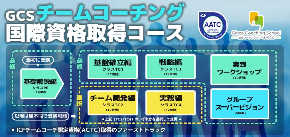 銀座コーチングスクール(略称:GCS)は既にICFのレベル1認定・レベル2認定を取得しており、このたびAATC認定を加えたことで、レベル1・レベル2・AATCの3種の認定を保有する日本初のコーチングスクールとなりました。