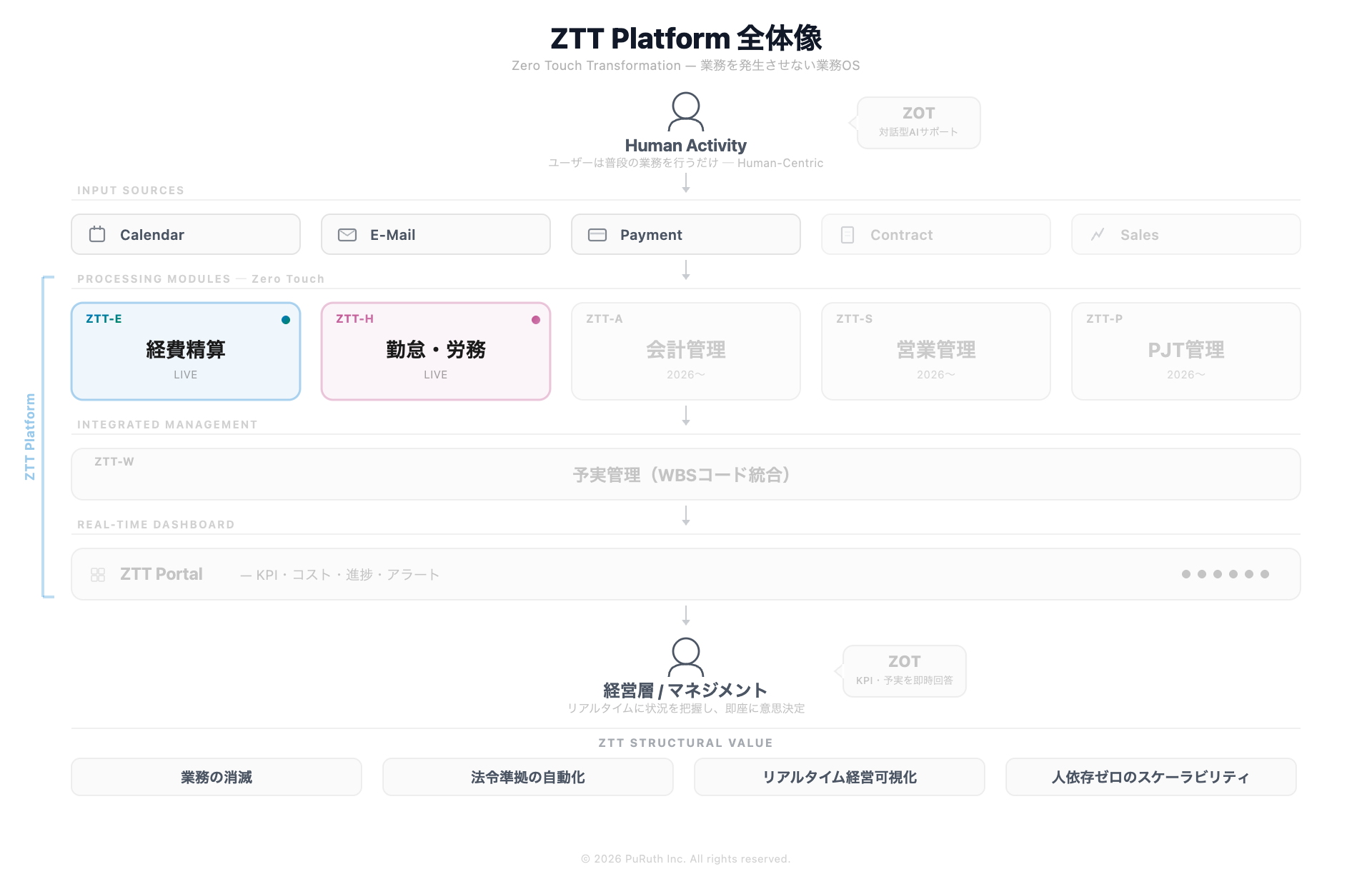 ZTT Platformは、6つの機能群+ダッシュボードで構成されます。すべての機能は、人間のビジネス活動(Human Activity:カレンダー・メール・支払い・契約・商談など)を起点とし、同じデータを複数の視点・文脈で解釈する「文脈翻訳型アーキテクチャ(CTA)」の思想で構築されています。