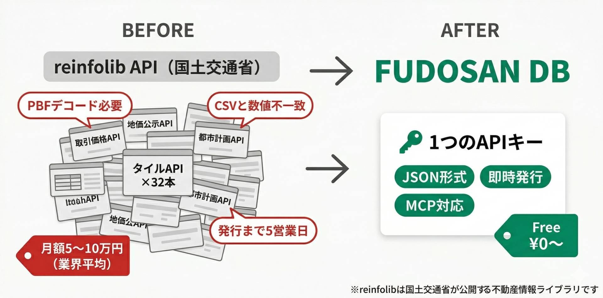 タイルAPIはJSONではなくPBF(Protocol Buffer Binary Format)で返ってくるため、デコードと座標変換が必要です。CSVとAPIで同じ取引の面積が5〜15m²ずれるため、単純なJOINでは統合できません。前処理だけで数週間〜数ヶ月。その間、本来のプロダクト開発は止まります。また、APIキーの発行にも数日以上かかります。