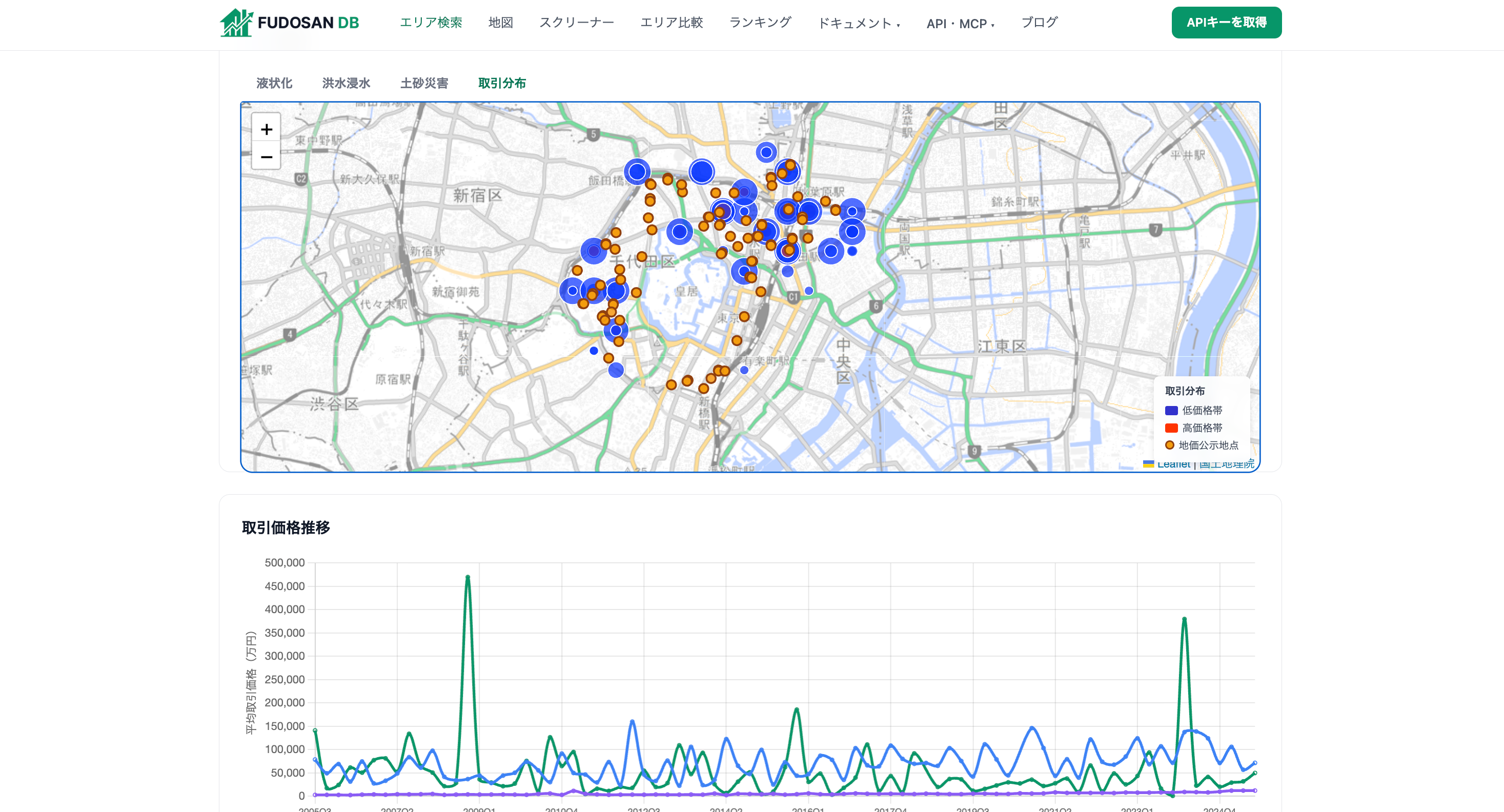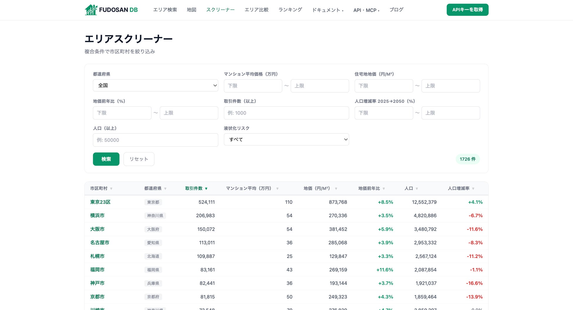 売買取引価格620万件超、地価公示・調査13万件に加え、機械学習による賃料推定エンジン(誤差率1.8%)、賃料変動予測、収益シミュレーションを搭載。ChatGPTやClaudeからコネクタ経由で直接接続でき、自然言語で不動産データを分析できます。