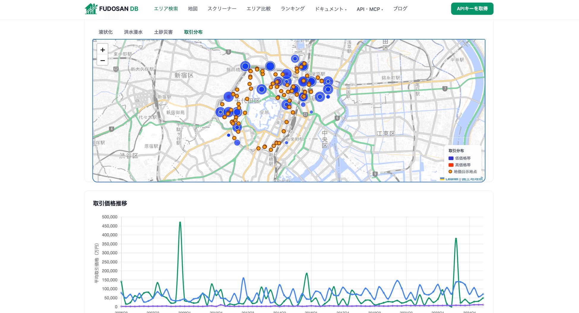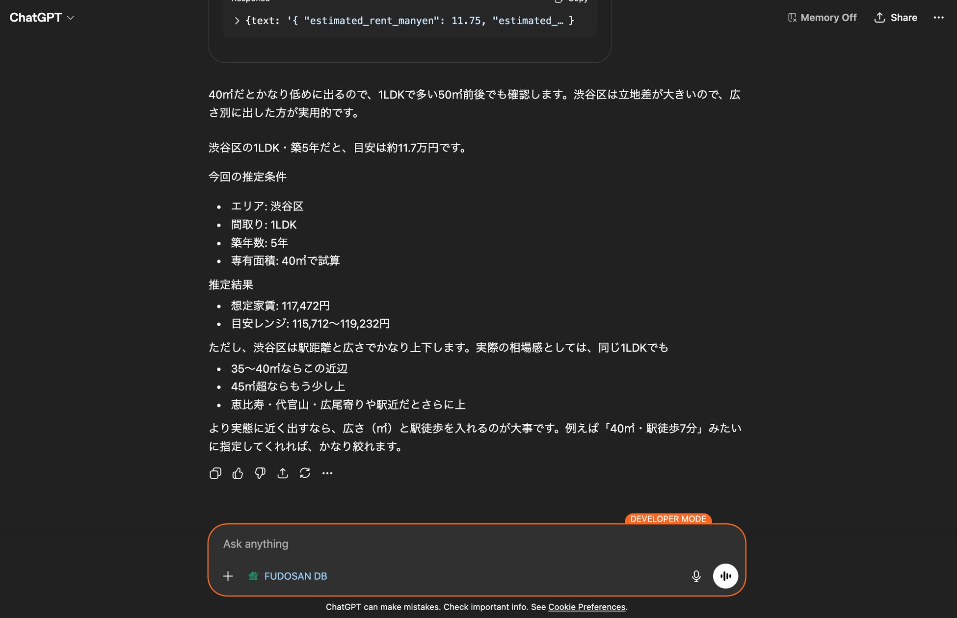 「渋谷区の1LDK、築5年の家賃相場は?」と聞けば、実データから推定賃料を返します。「港区と世田谷区の地価推移を比較して」と言えば、過去20年分のデータをグラフ付きで出します。AIがWeb検索で断片的な情報を拾い集めるのではなく、構造化されたデータベースから直接取得するため、参照データと回答の信頼性が段違いに変わります。