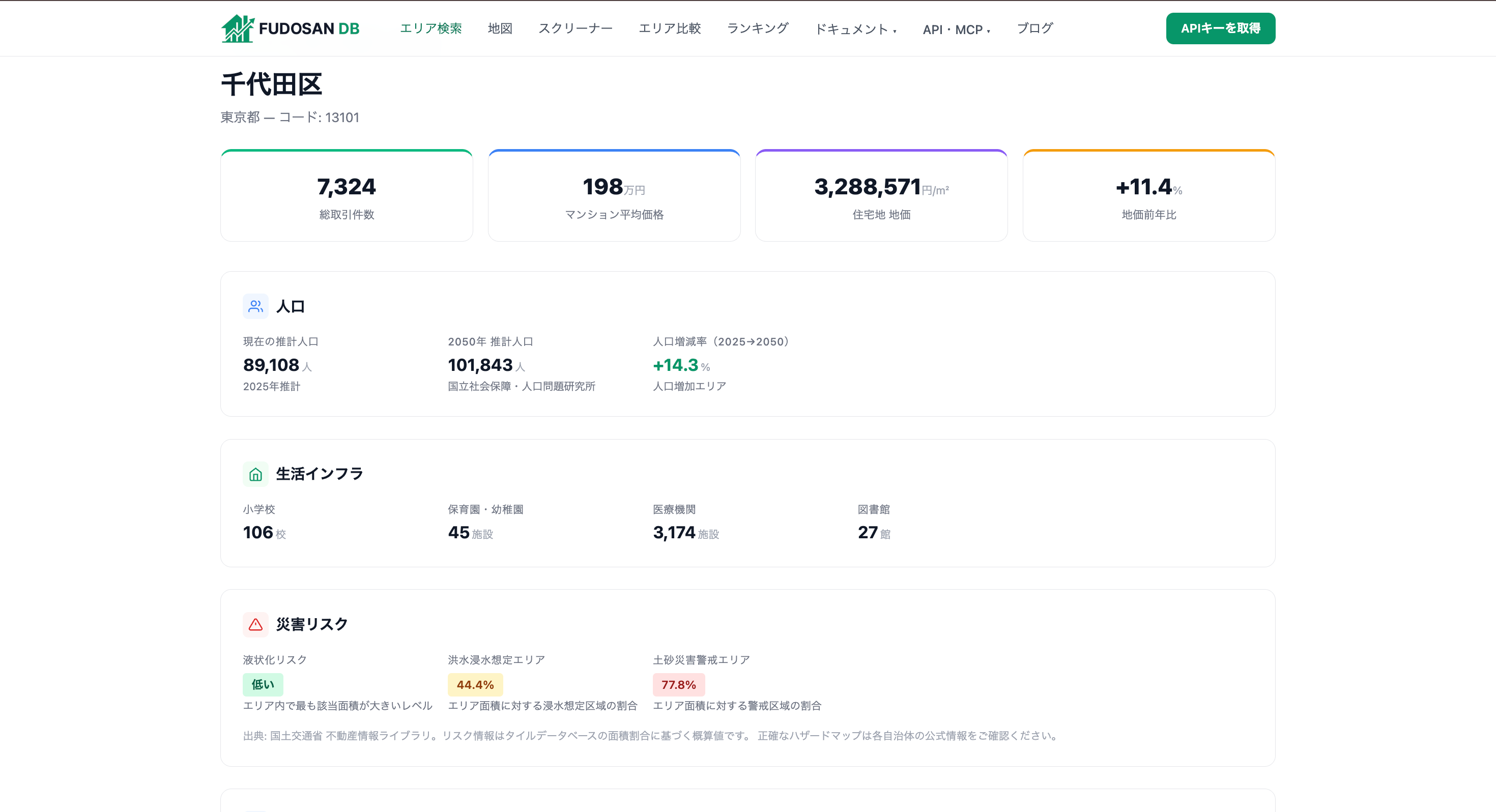 エリア詳細(人口推移・施設・災害リスク・ハザードマップ)