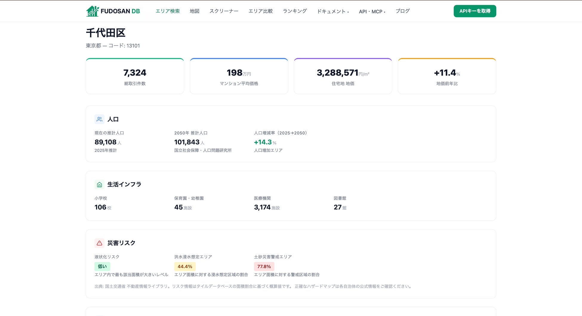 reinfolib APIが公開されてから2年。4,000名以上がキーを取得しているにもかかわらず、この2つの壁を越えて全35種類のデータを統合し、構造化データとして提供するサービスは生まれていませんでした。日本全国の取引価格から地価、都市計画まで網羅する貴重な公的データが、前処理の重さとコストの壁によって十分に活用されていないのが現状です。