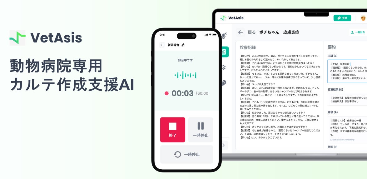 VetAsisは、診察中の獣医師と飼い主の会話をリアルタイムに記録し、SOAP形式(Subjective/Objective/Assessment/Plan)で自動要約することで、診療後のカルテ作成業務の効率化を支援するソリューションです。