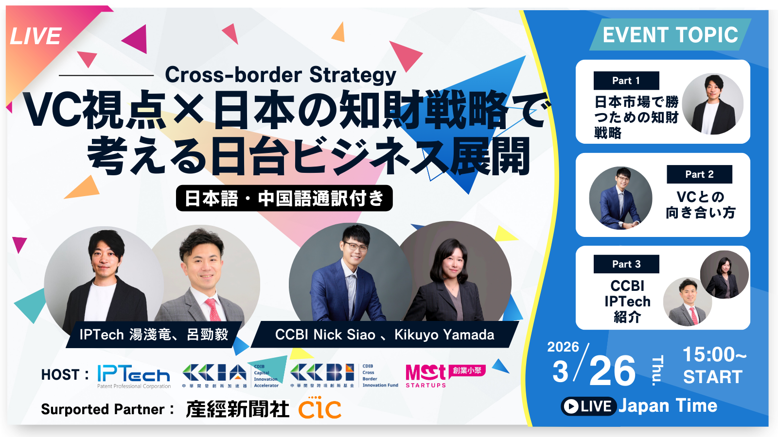 IPTech弁理士法人(所在地:東京都港区、代表:安高史朗)は、台湾最大級のベンチャーキャピタルグループCDIB(中華開発資本)の関連組織であるCCIA(CDIB Capital Innovation Advisors)と共催で、2026年3月26日(木)にオンラインセミナー「VC視点×日本の知財戦略で考える日台ビジネス展開」を開催いたします。