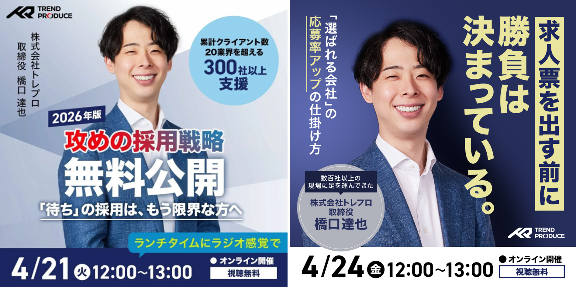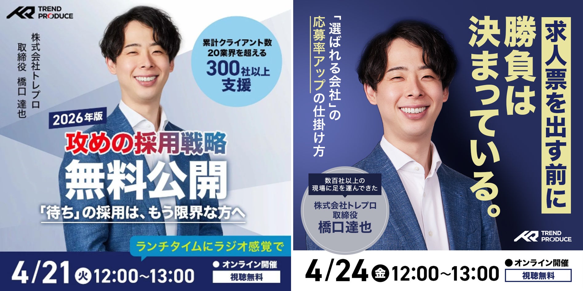 SNS採用支援を専門とする株式会社トレプロ(以下トレプロ、本社:東京都港区赤坂1-12-32 アーク森ビル35階、代表取締役:金山 卓真)は、採用担当者、経営層、HR責任者を対象に、無料オンラインセミナーを2026年4月21日(火)および4月24日(金)の各日12:00~13:00に開催いたします。4月21日は「『待ち』の採用はもう限界。2026年版・攻めの採用戦略」、4月24日は「求人票を出す前に勝負は決まっている?『選ばれる会社』の応募率アップの仕掛け方」をテーマに、採用市場の変化を踏まえた実践的な考え方と、SNS採用・採用広報・応募導線設計のポイントをお伝えします。