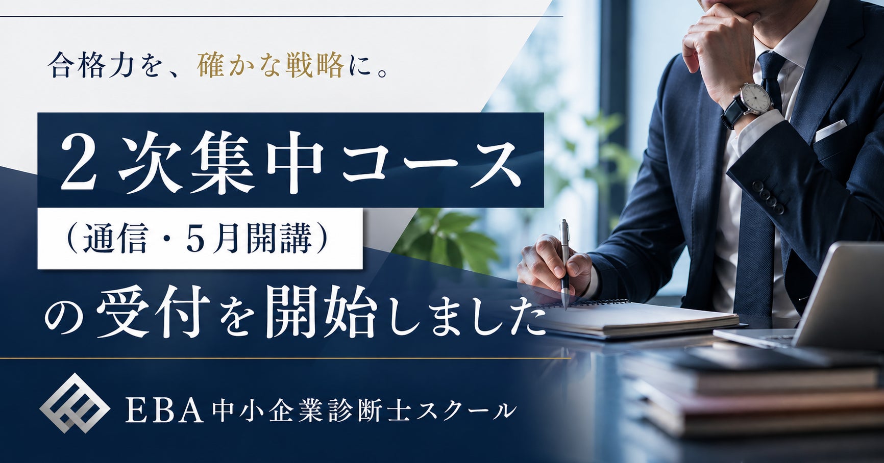 過去問・再現答案・得点開示データの分析に基づく2次試験対策で合格者を輩出してきたEBA中小企業診断士スクール(運営:株式会社EBA)は、令和8年度(2026年度)対策の「2次集中コース」において、通信クラス・5月開講コースを新たに設定し、受付を開始しました。