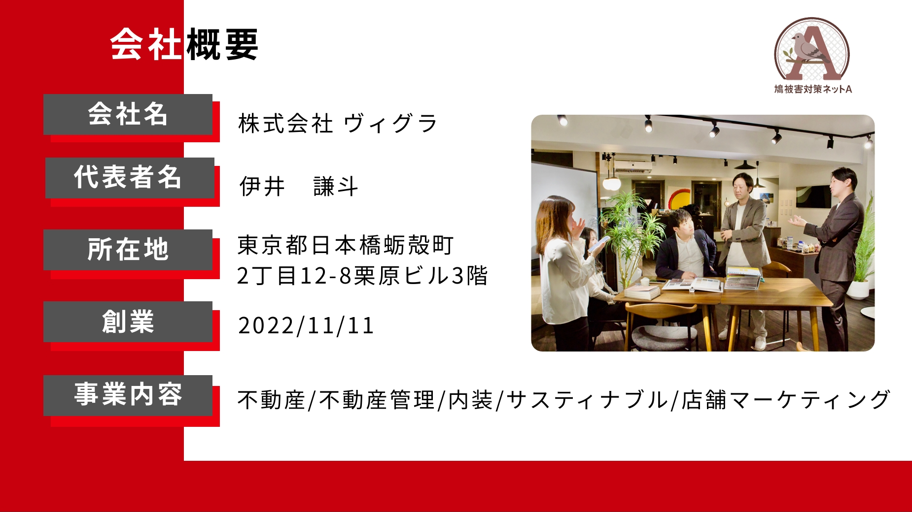 事業内容:鳩対策フランチャイズ事業の運営、防鳥ネットの販売・施工、清掃事業
