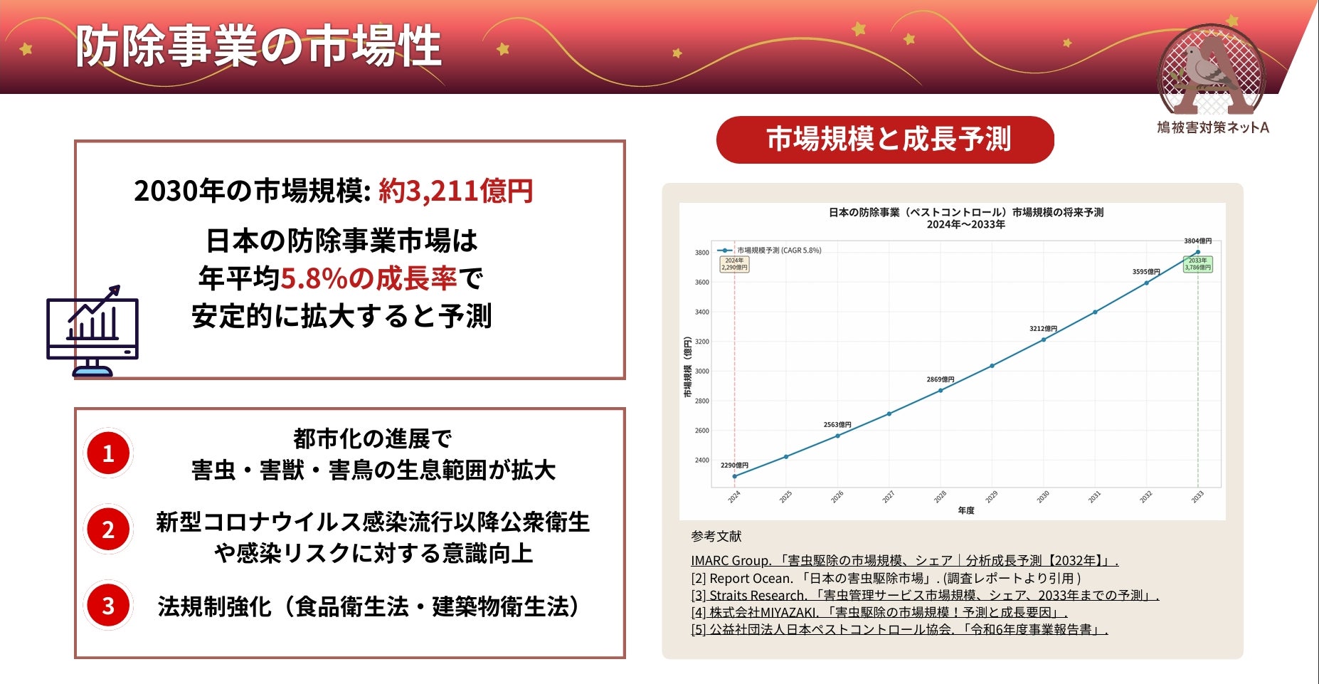 日本の防除事業(ペストコントロール)市場は、都市化や衛生意識の高まりにより年平均5.8%の成長を続け 、2030年には約3,211億円に達すると予測されています 。しかし、身近なハウスクリーニング業(約15,000事業者)と比較し、害鳥対策を含む防除業者は約5,000事業者と、わずか3分の1程度に留まります 。