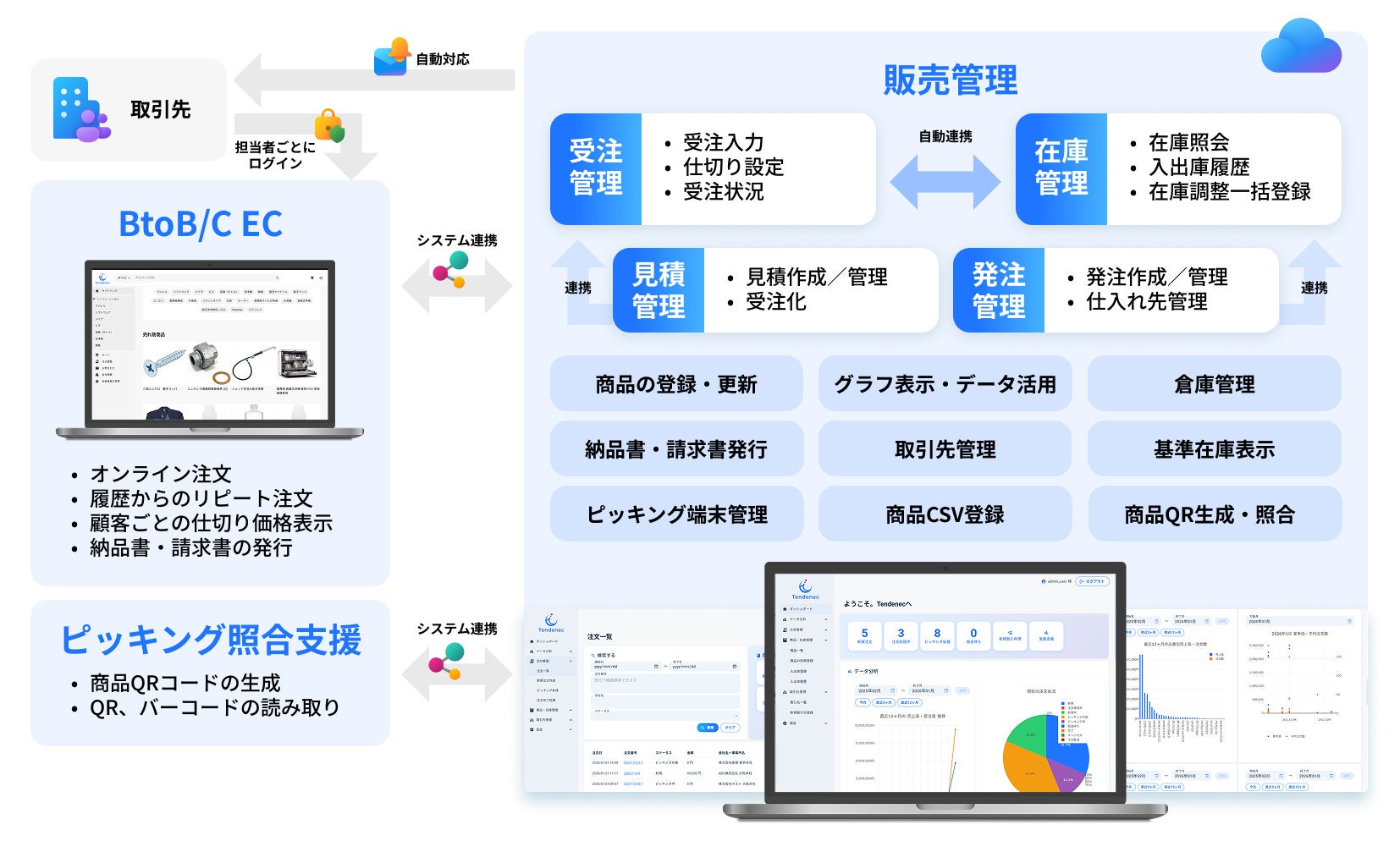 その理由は、Tendenecが単なる一部機能のツールではなく、販売管理システムとして業務全体を網羅している点にあります。具体的には、在庫管理、受注管理、見積管理、請求管理、ピッキング照合機能、データ分析、顧客管理、発注管理、仕入れ先管理、さらにはECによるオンライン受注機能など、多様な業務を一元的にカバーしています。