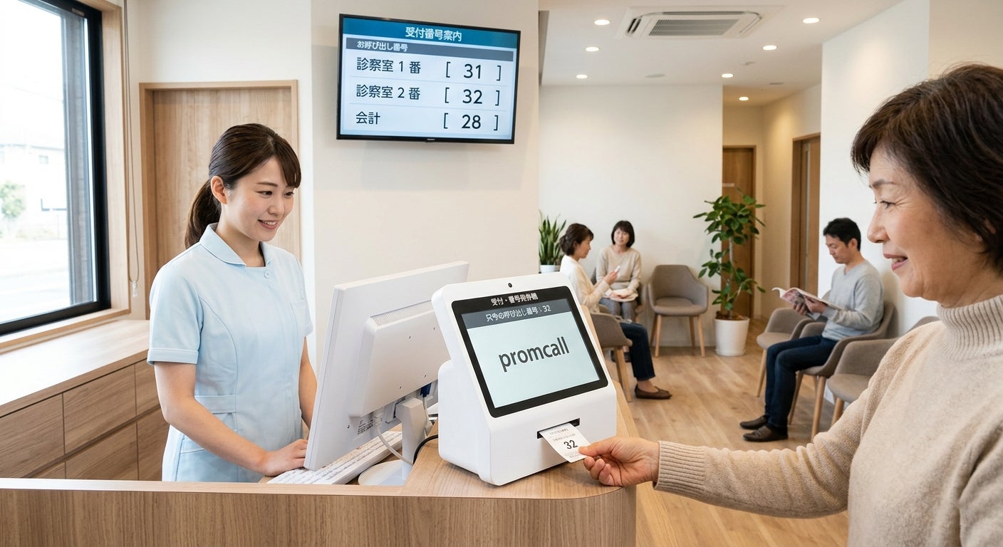 prom call(プロモコール)は、受付・番号発券・呼び出し・表示案内をデジタル化することで、受付業務の効率化と患者の待ち時間ストレス軽減を実現する番号呼び出しシステムです。