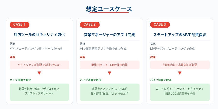 これらの課題に対し、当社が創業以来培ってきたシステム開発・保守・脆弱性診断のノウハウと、最新の生成AI技術を組み合わせることで、「バイブコーディングの成果物を、実用に耐えるシステムへ仕上げる」という新たな価値を提供できると考え、本サービスの提供に至りました。
