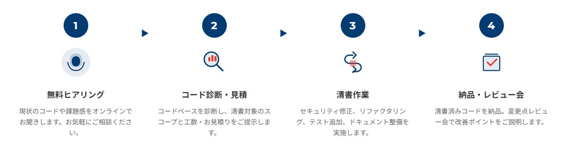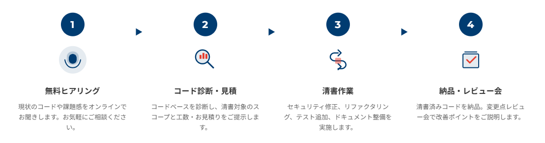 コードレビュー・リファクタリング・テスト整備・セキュリティ診断を実施し、投資家へのデューデリジェンスに耐えられる品質を担保します。