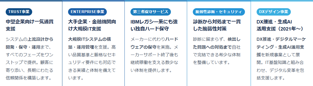 TRUST事業:中堅企業向けにシステムの上流設計から開発・保守・運用までを一気通貫で提供