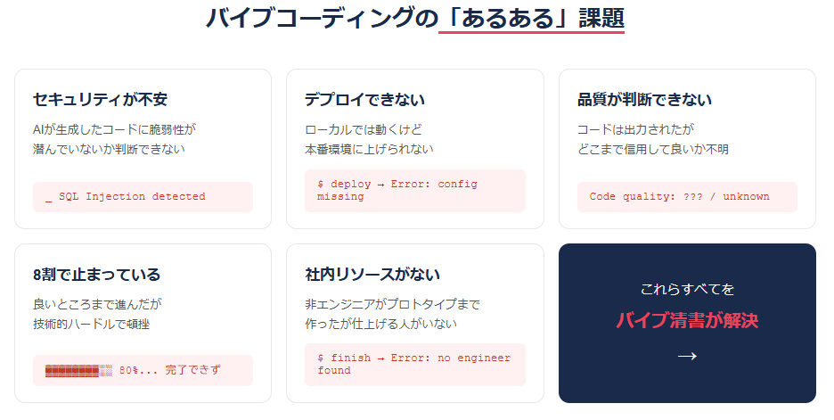 バイブコーディング(生成AIを活用したプログラミング)で生まれた「動くけど不安なコード」「企画は良いが本番運用には耐えられないプロトタイプ」を、脆弱性診断・コードレビュー・リファクタリング・デプロイ・ホスティングまで一貫して対応し、お客様の意図を汲み取りながら「実用に耐えるシステム」へと仕上げる新サービス「バイブコーディング清書サービス ― バイブ清書」の提供を開始いたします。