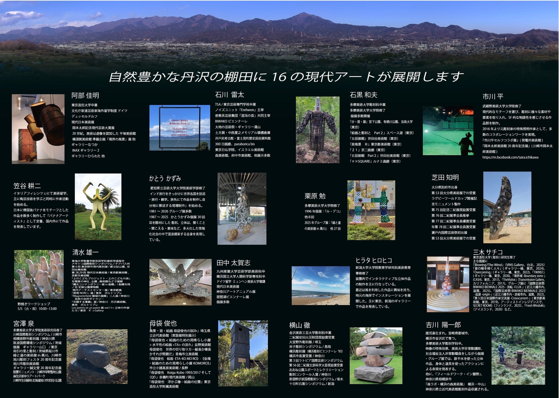 神奈川県秦野市を中心に著名作家から小学生まであらゆる垣根を外して市民の皆さんと共に歩んできた丹沢アートフェスティヴァルが今年で20周年となりました。今回は20周年企画として丹沢棚田野外彫刻展/5WINDSー5人の版画家/黒澤明ドキュメンタリー上映会を企画しました。5/1〜5/31の期間中秦野市周辺エリアの40のギャラリー等平面立体現代アート音楽映画やワークショップが行われます。ぜひご来場ください。