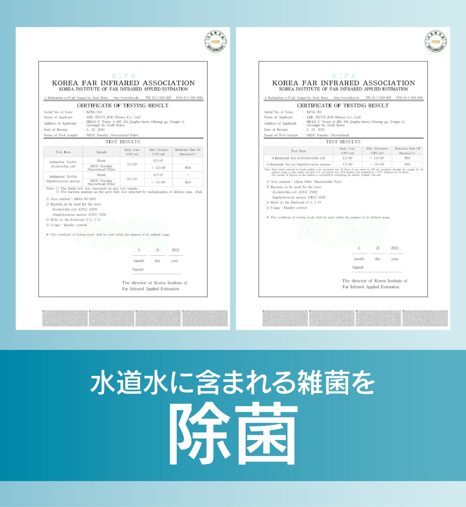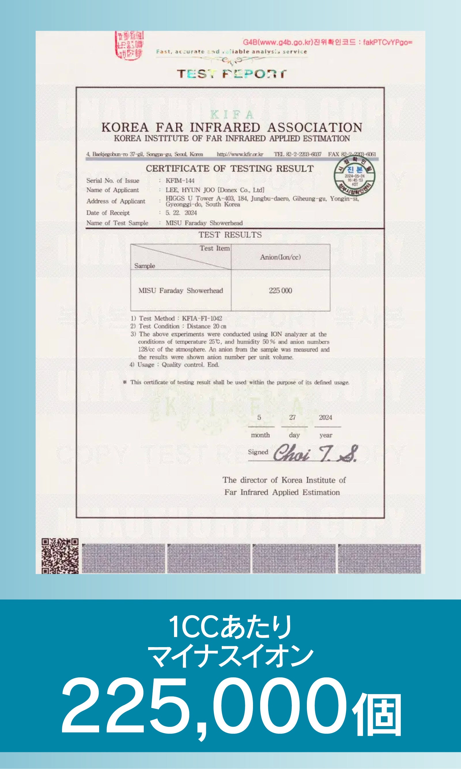 KFIA(韓国遠赤外線協会)の第三者測定(試験番号KFIM-144)で、MISUのファラデーフィルターは1ccあたり225,000個のマイナスイオンを発生することが証明されています。