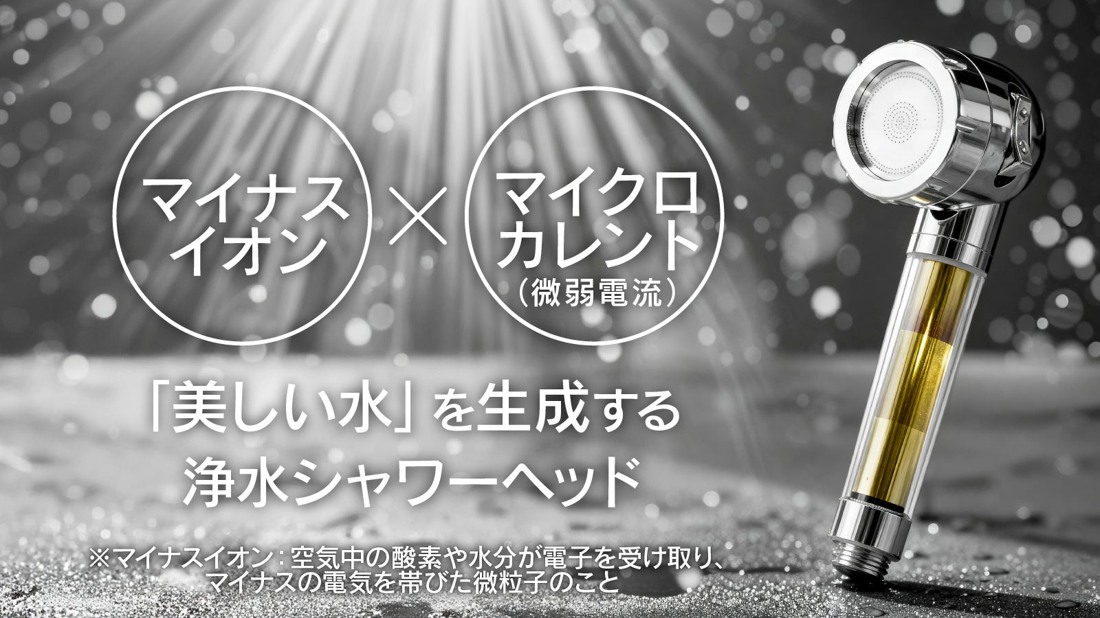 ナイアガラの滝周辺を上回る225,000個/ccのマイナスイオン。電源不要の特許技術で雑菌を99.9%減少、残留塩素も低減。第三者機関が証明した「美しい水」を自宅のバスルームへ。