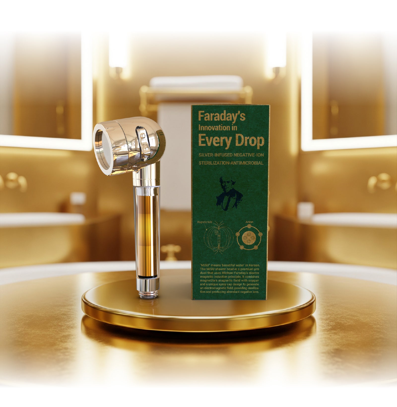 ファラデーの電磁誘導原理に基づき、銅と磁石の組み合わせで電源なしにマイクロカレント(微弱電流)を発生します。高圧縮不織布×バイオセラミックのWフィルター構造と、99.99%銀プレートを組み合わせた多層設計で、水質浄化・塩素低減・マイナスイオン生成を1本で実現します。