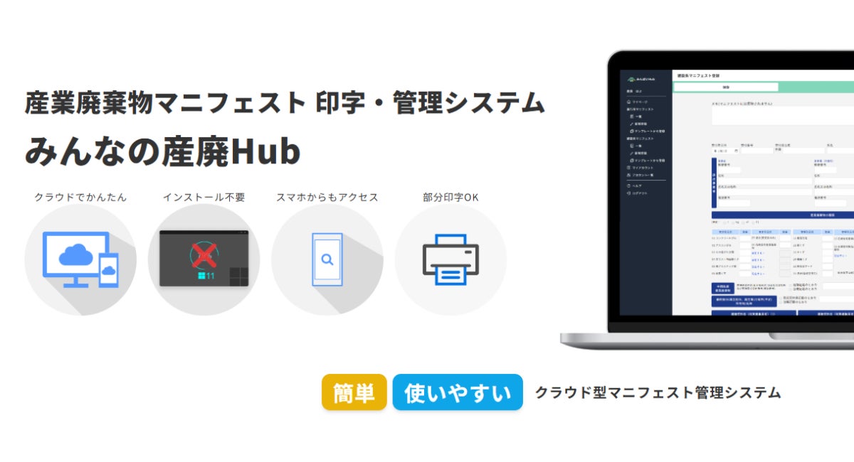 『みんなの産廃Hub』は、産業廃棄物マニフェストの作成・管理をクラウド上で行えるシステムです。
