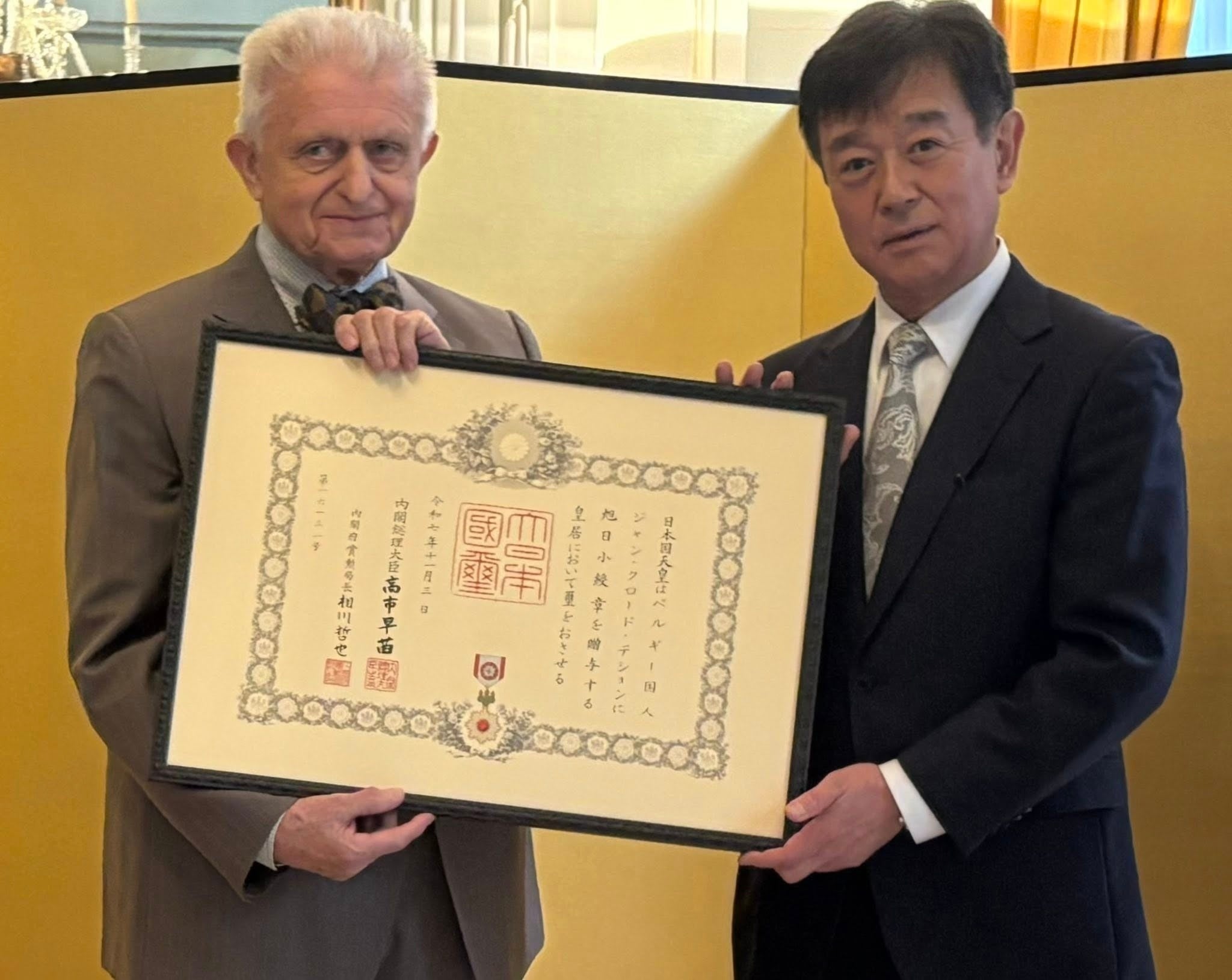 デシャン氏は、長年にわたり日・ベルギー両国の経済関係の発展およびビジネス交流の促進に貢献したことが評価され、今回の受章となりました。授章式は2026年2月13日、ベルギー・ブリュッセルの在ベルギー日本国大使館にて執り行われ、日本国天皇陛下および日本国政府を代表し、駐ベルギー日本国大使の大菅毅氏が授章を行いました。