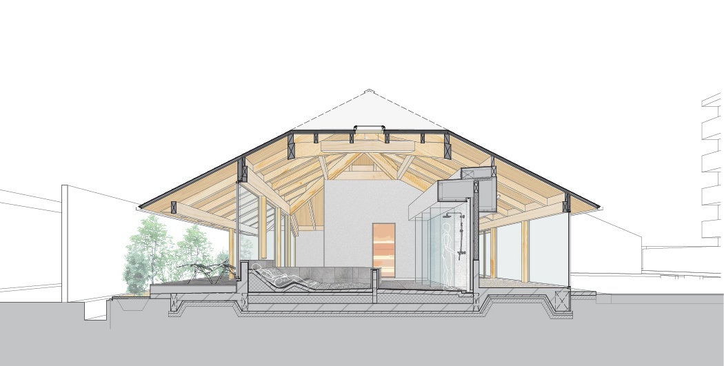 建築は、5.5間の正方形平面に大きな「宝形(ほうぎょう)屋根」を冠した、善光寺の経蔵にも似た凛とした佇まい。高い天井による浴室内の圧倒的な開放感と、低い軒先が生み出す縁側の心地よさという相反する要素を、一つの屋根の下で実現しました。