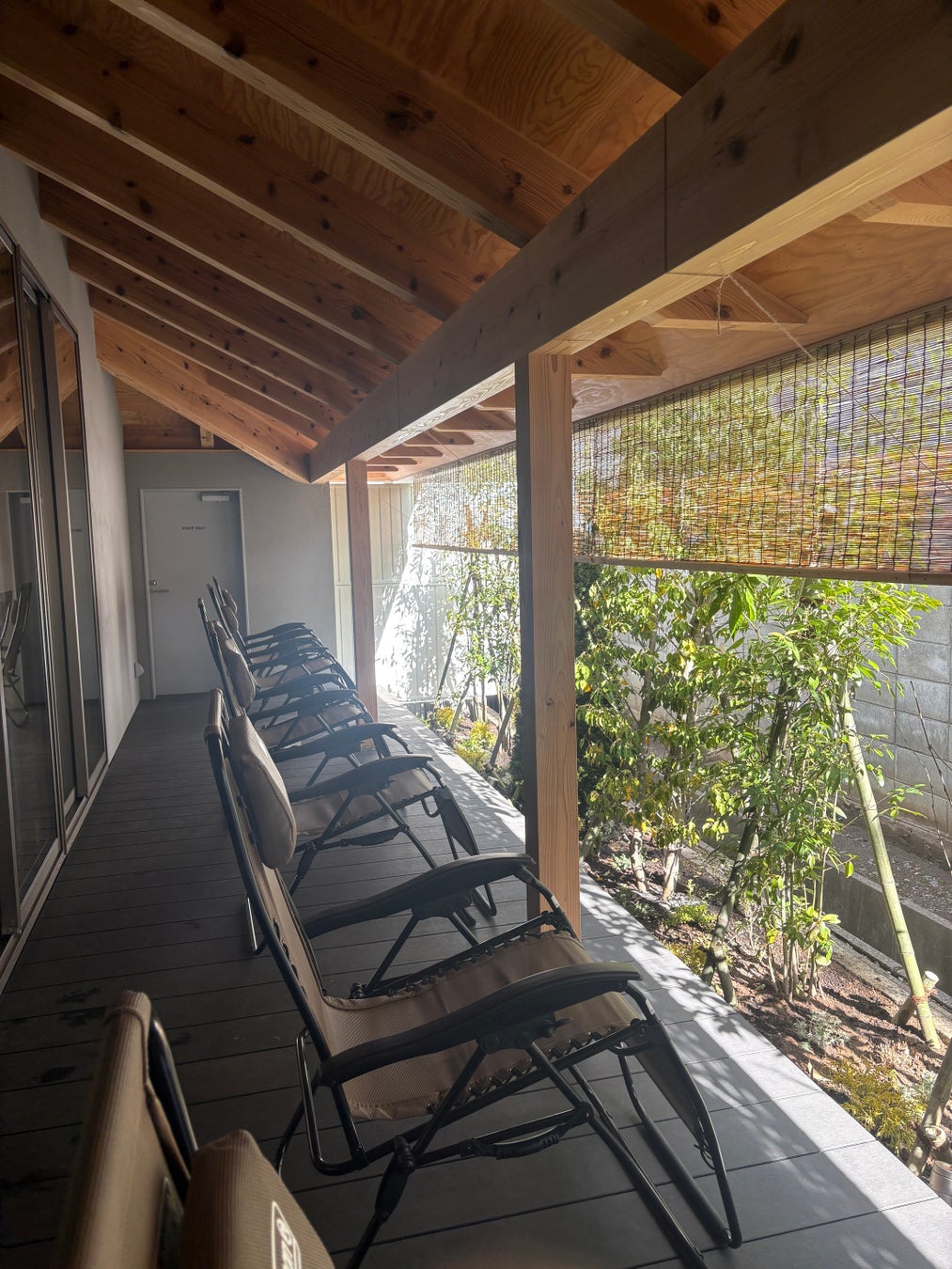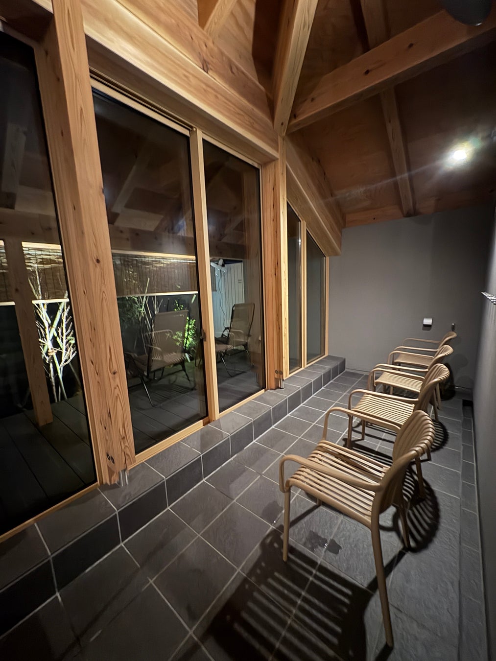 市街地の喧騒を断つ「植栽と縁側」:広々とした縁側には、信州の山々を感じる樹種を選定。空を仰ぐ外気浴体験は、ここが長野駅から車で5分の市街地であることを忘れさせる、圧倒的な静寂を提供します。