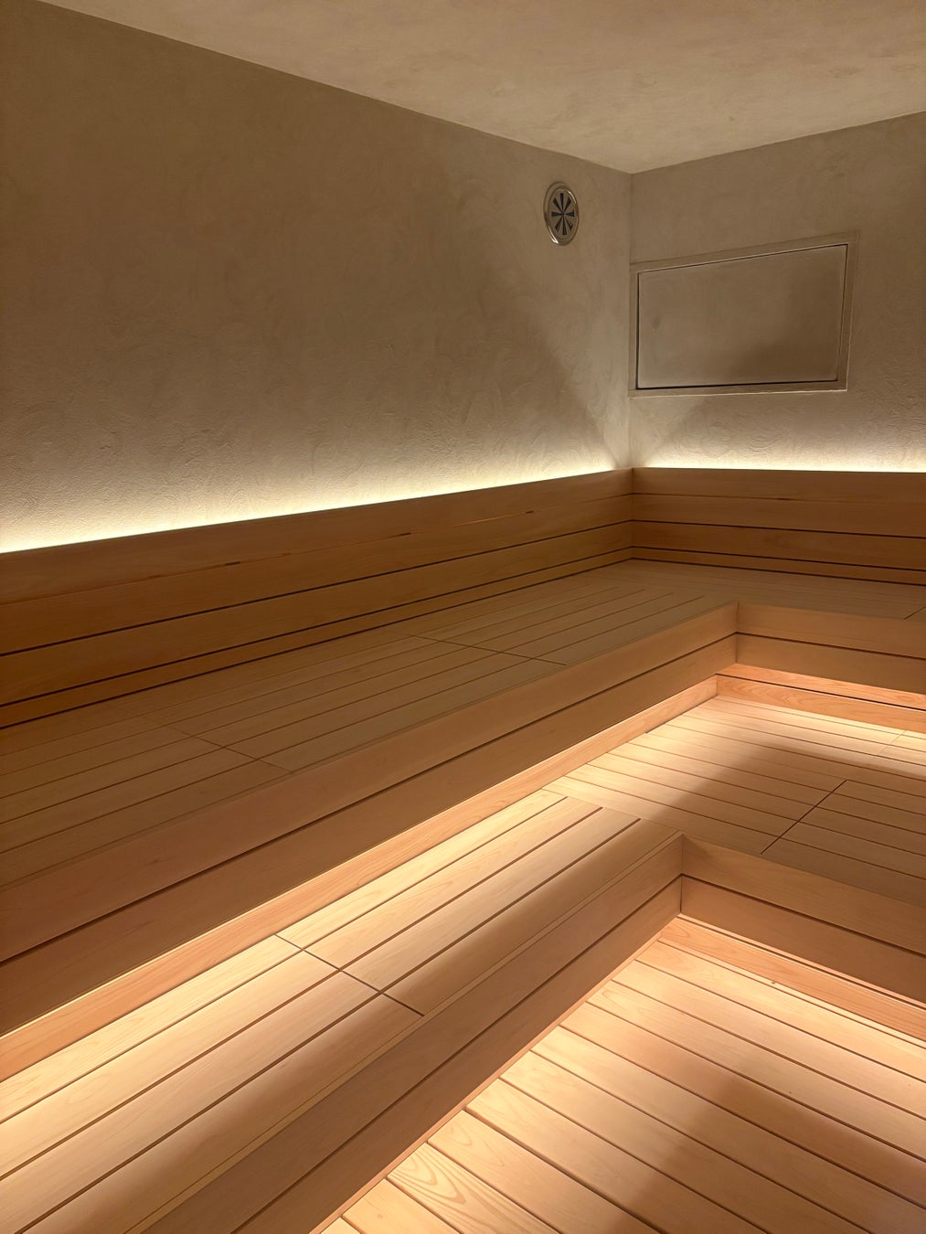 100%天然素材が紡ぐ、至高の調湿空間:サウナ室内には、天然素材100%の「水硬性石灰」による左官材を使用。さらにベンチには無垢のヒノキ材、構造材には八溝杉(やみぞすぎ)を現しで使用しています。これらの木材が持つ自然の調湿効果と視線を上部へ誘う構造美が、心身を深いリラックスへと導きます。
