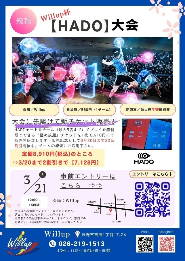 [第1回Willup杯【HADO】大会]を、長野市初のARスポーツ施設Willupが、2026年3月21日(土)に開催