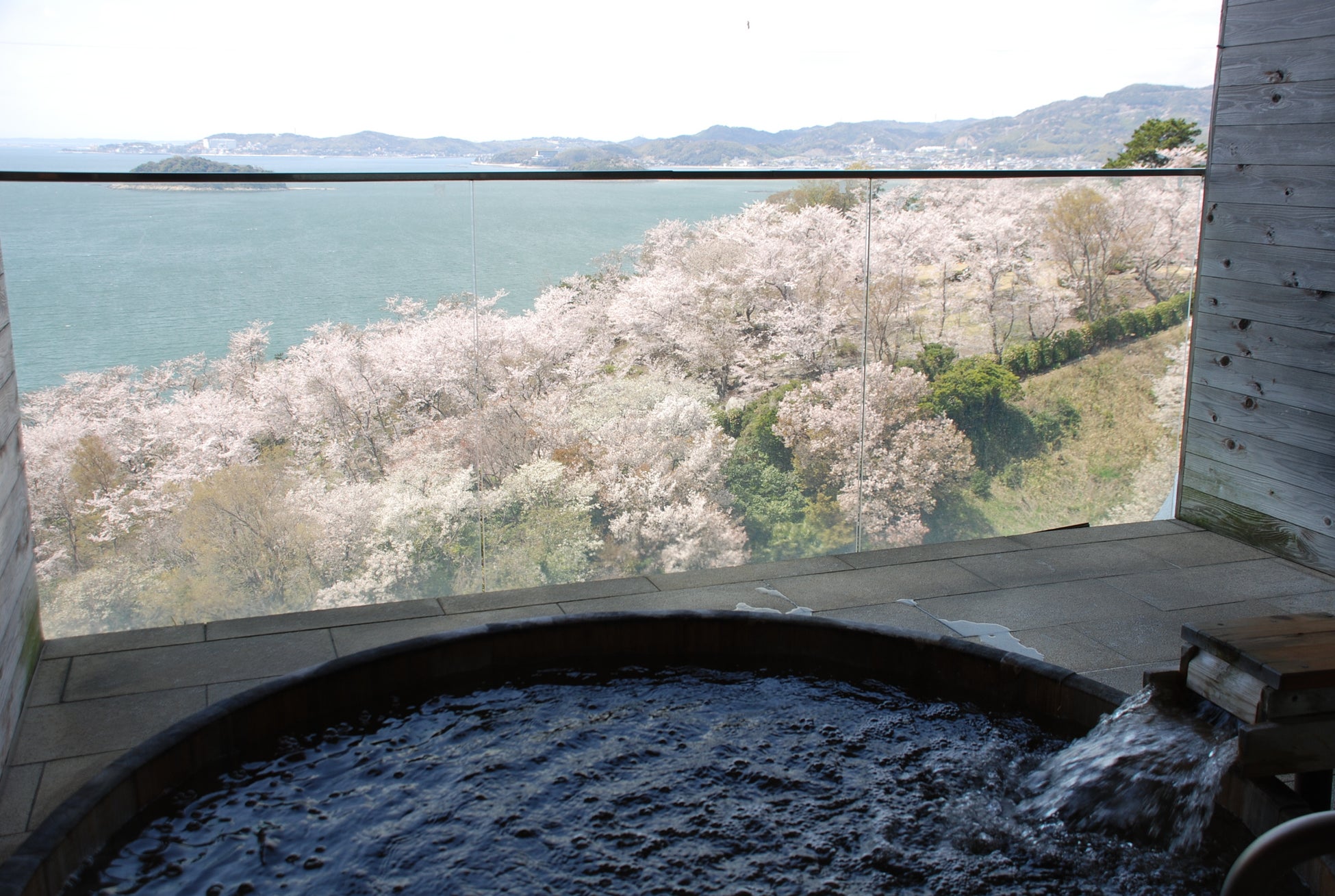 三河湾を一望する絶景大浴場は、日帰りでも利用可能。気軽に春の海と桜を楽しめます。