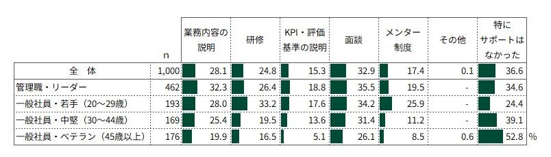 職場環境の変化に際し、会社からのサポートを「受けていない」人は36.6%にのぼり、特に一般社員のベテラン層では52.8%と半数を超えています。若手層には研修やメンター制度が比較的提供されている一方、ベテラン層では評価基準(KPI)の説明やメンター制度が不足していることが伺えます。