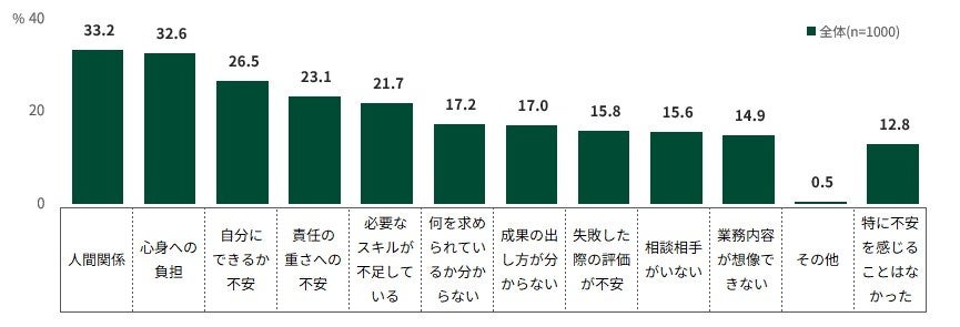 環境変化に対する不安として多かったのは、「人間関係」33.2%、「心身への負担」32.6%、「自分にできるか不安」26.5%といった項目であり、業務内容よりも人や環境への適応が大きなストレス要因となっている傾向が見られました。