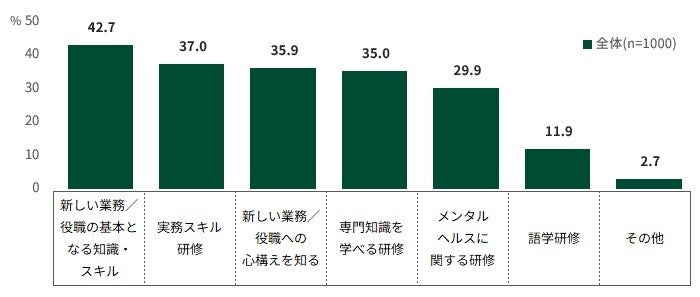 環境変化の前後に、どんな研修やサポートが必要だったかを聞く設問では、「新しい業務/役職の基本となる知識・スキル」42.7%、「実務スキル研修」37%と、実際の業務に直結する知識やスキルが必要とされていることが分かりました。
