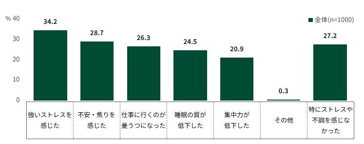 具体的な内容としては、「仕事に行くのが憂うつになった」26.3%、「睡眠の質が低下した」24.5%、「集中力が低下した」20.9%などが挙げられ、パフォーマンスの低下につながる不調が多く見られました。