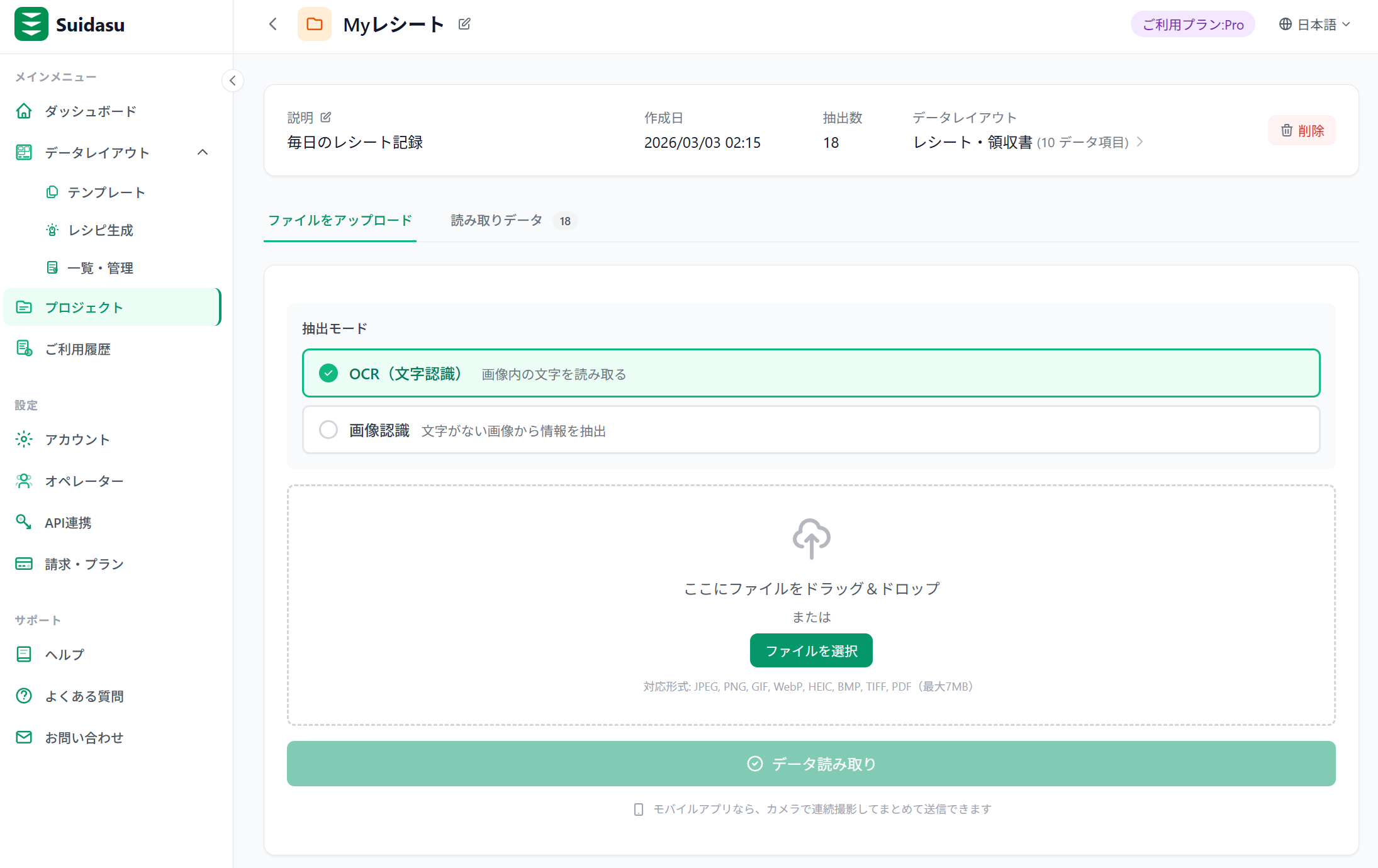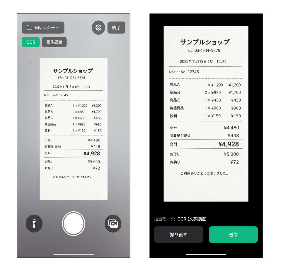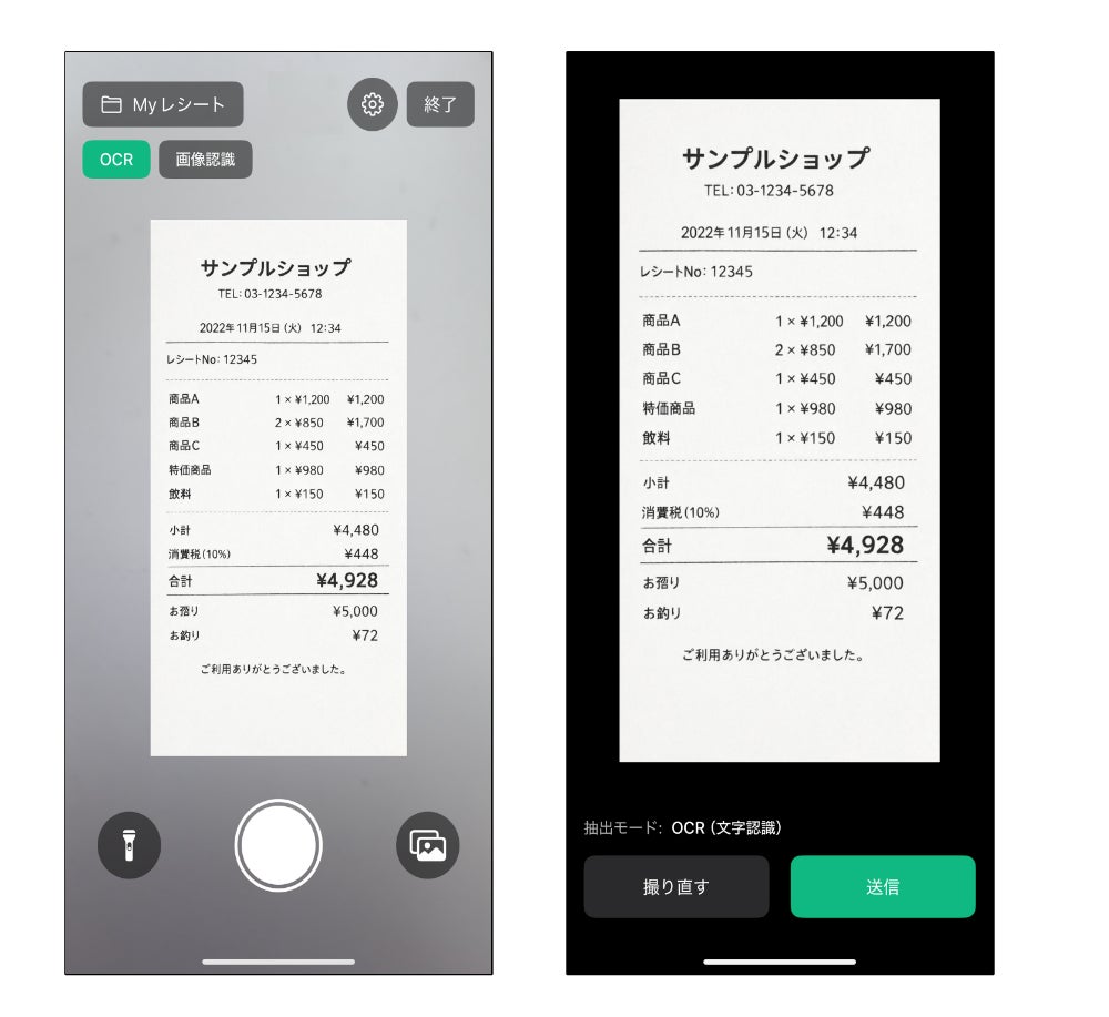 テキストを読み取る「OCRモード」と、写真から情報を読み取る「画像認識モード」を搭載。帳票だけでなく、あらゆる画像からデータ化が可能。