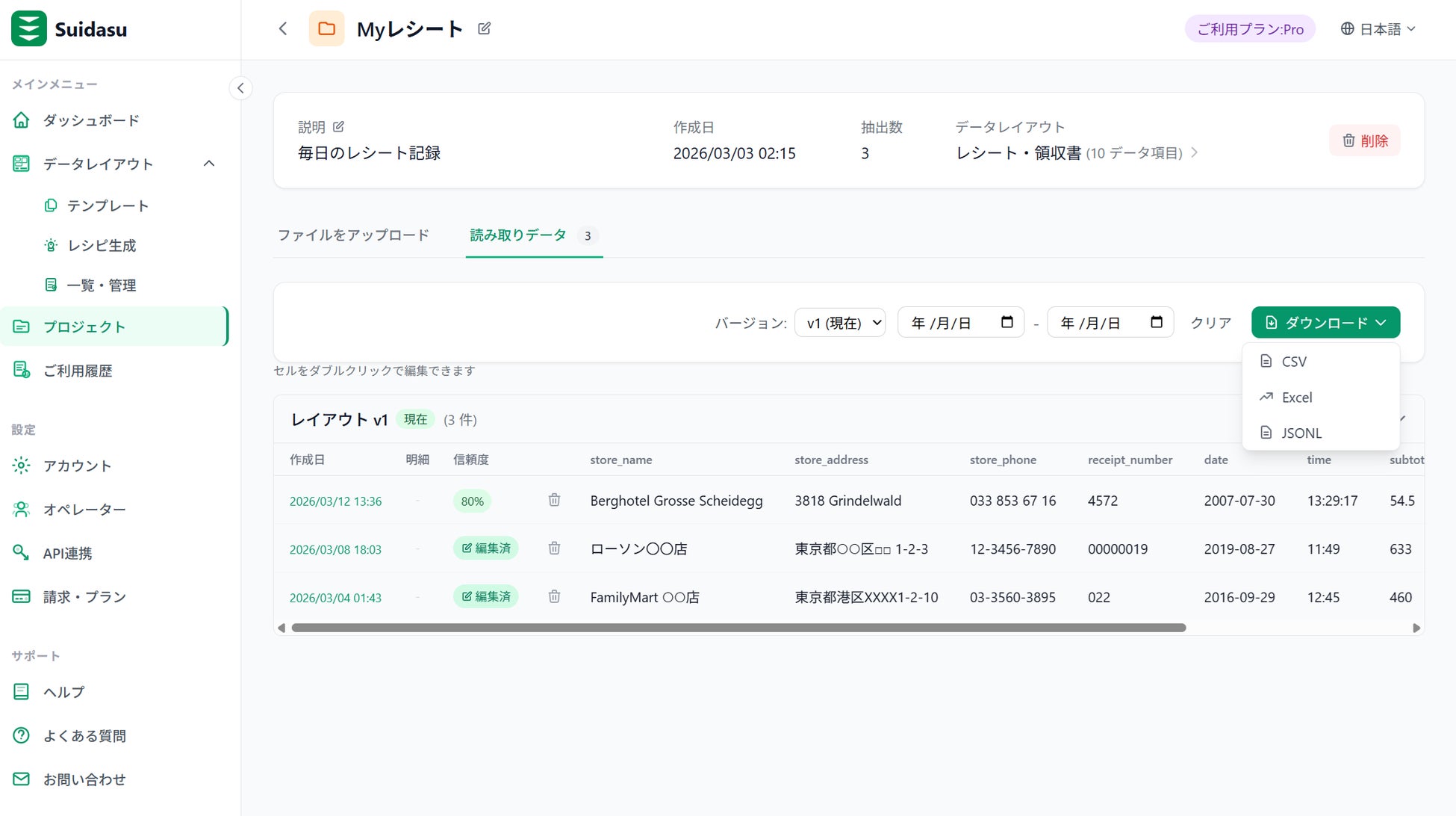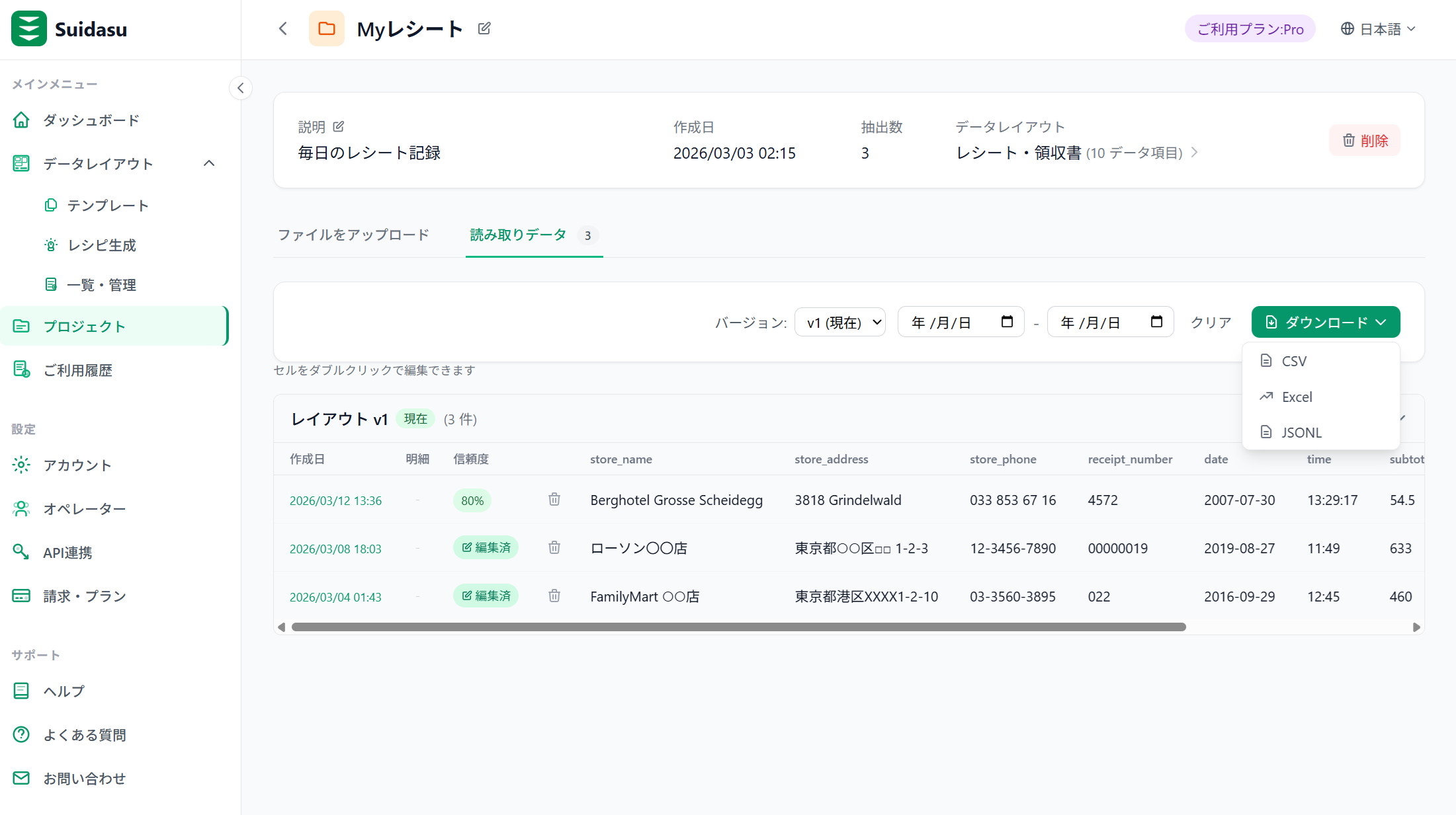 CSV・Excel・JSONLエクスポート