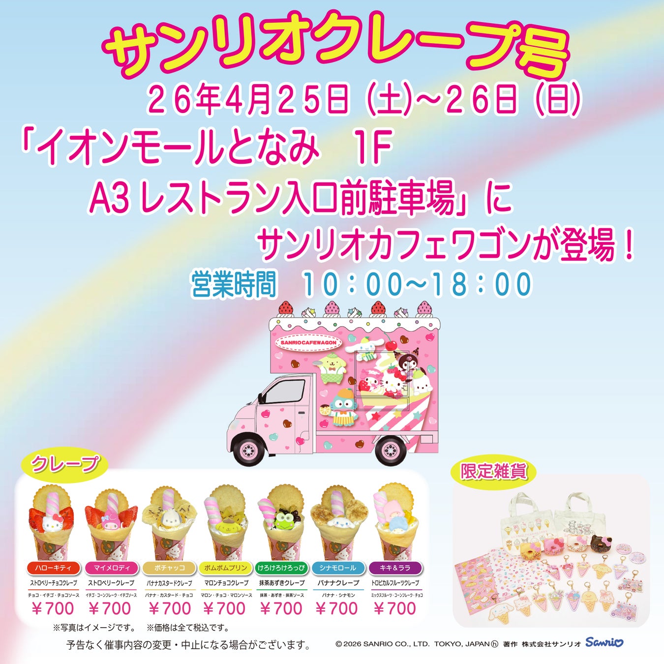 カワイイ「サンリオキャラクタークレープ」や、ここでしか買えない「サンリオカフェワゴングッズ」を販売致します。