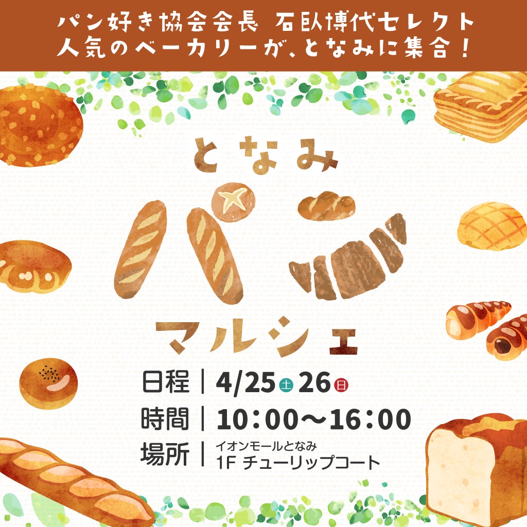 イオンモールとなみ(所在地:富山県砺波市中神一丁目174番地)は、2026年4月25日(土)~5月6日(水・休)のゴールデンウィーク期間、「となみチューリップGW」を開催します。スプレーアートエデンがやってくる!、パン好き協会会長・石臥博代セレクトの人気ベーカリーが集まるパンマルシェなどのイベントのほか、チューリップフェア半券特典や、WAON POINT10倍、ガソリン応援キャンペーンなど、お買い物がさらに楽しくなる企画を多数ご用意します。