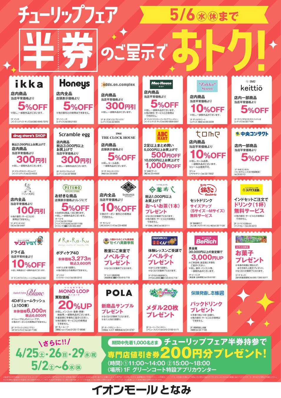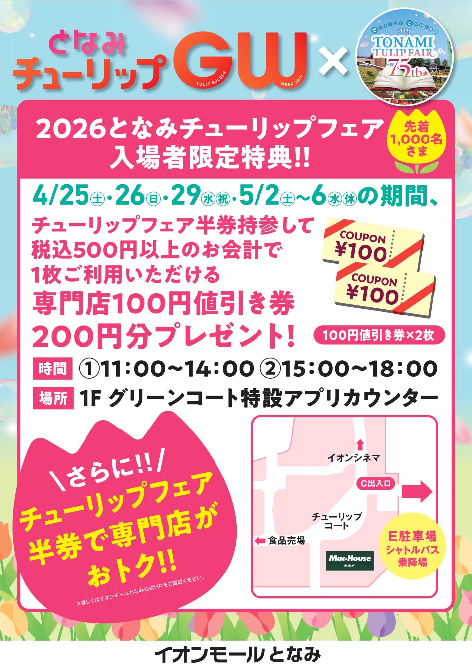 チューリップフェア半券のご持参で、税込500円以上のお会計で1枚ご利用いただける専門店100円値引き券200円分(100円値引き券×2枚)プレゼントいたします。