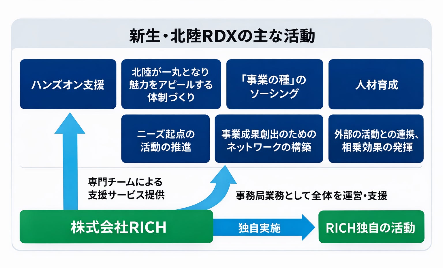 「北陸RDX」がプラットフォームとして地域の企業、大学、公的支援機関、経済団体をつなぎ、事業会社「株式会社RICH」が事業創出の実行組織としてハンズオン支援を行います。この仕組みにより、北陸地域の優れた技術や人材を全国の企業や市場と結びつけ、新たなビジネスの創出を促進します。
