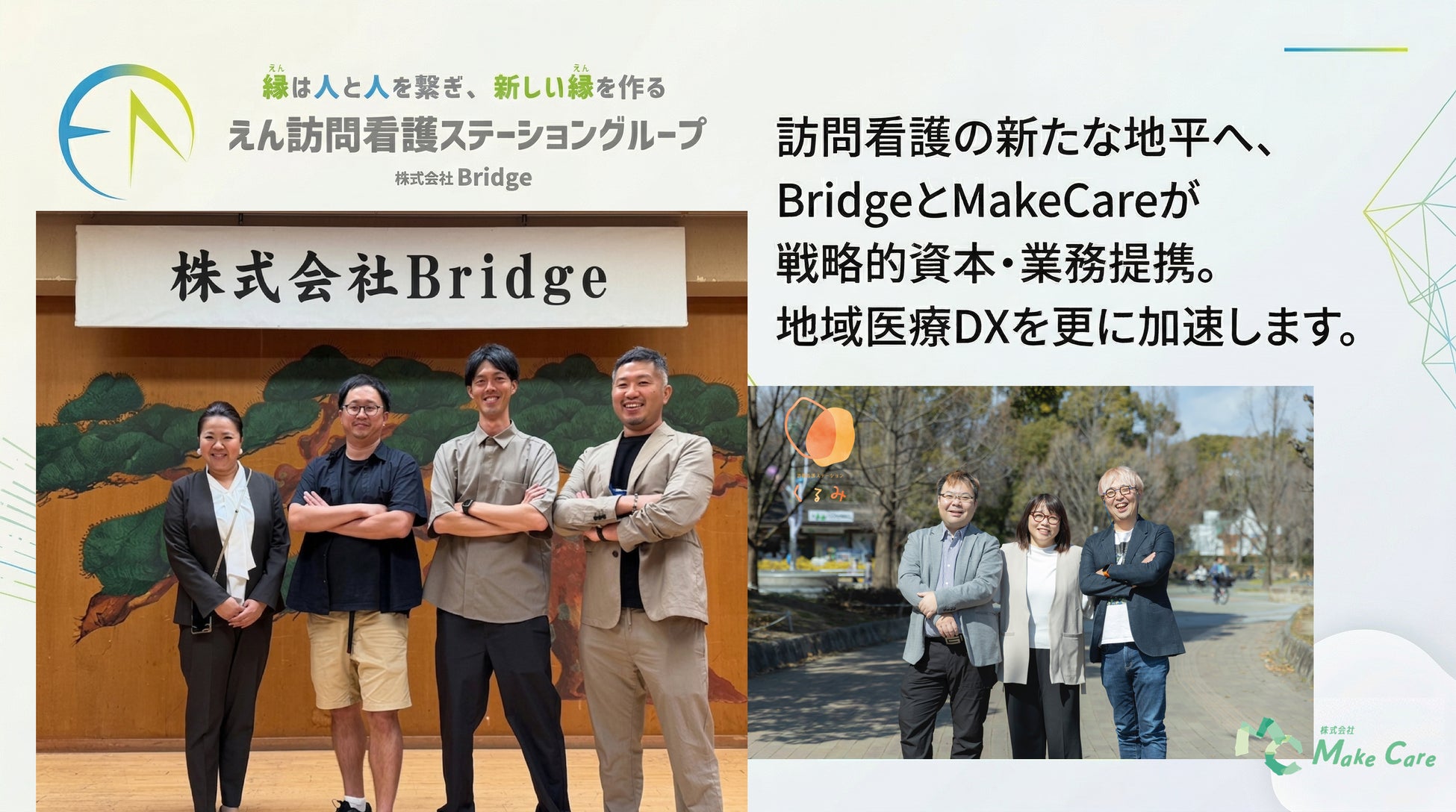 株式会社Bridge(本社:高知県高知市、代表取締役:鳥谷将由、以下「Bridge」)は、株式会社MakeCare(本社:大阪府大阪市、以下「MakeCare」)との間で、第三者割当増資による出資を含む資本提携および業務連携を開始したことをお知らせいたします。本提携により、Bridgeが展開する訪問看護事業のさらなる拡大と、採用・集患を含む経営基盤の強化を図り、在宅医療・介護領域における持続可能な成長モデルの確立を目指します。