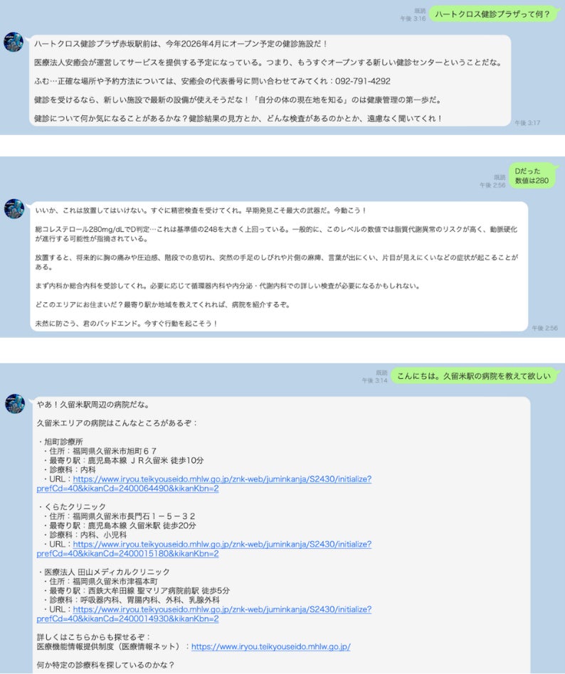 健診で異常値が出ても放置してしまう受診者に対し、リスクを分かりやすく伝え、次の行動へと導く伴走型AIサービスです。薬剤戦師「オーガマン」が24時間いつでも相談に対応し、LINE上で健診結果の解説、生活改善アドバイス、精密検査受診リマインドなどを提供。健診後の継続的な健康管理を支援します。