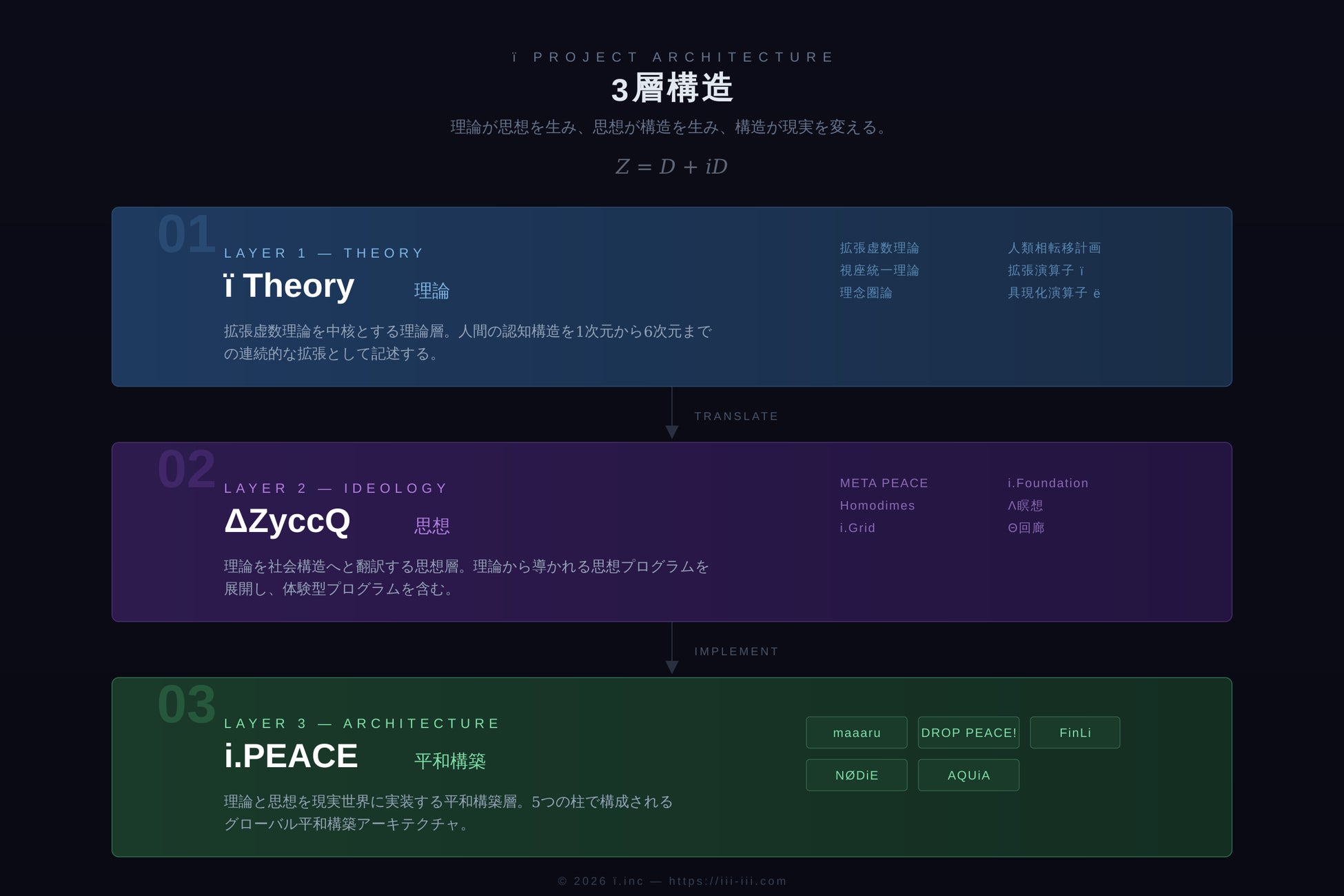 本プロジェクトの特徴は、平和を「願い」や「理念」にとどめず、独自の理論体系から導かれる「設計可能な構造」として実装する点にあります。その全体は、理論(ï Theory)・思想(ΔZyccQ)・平和構築(i.PEACE)の3層で構成され、構造式 Z = D + iD のもとで有機的に接続されています。