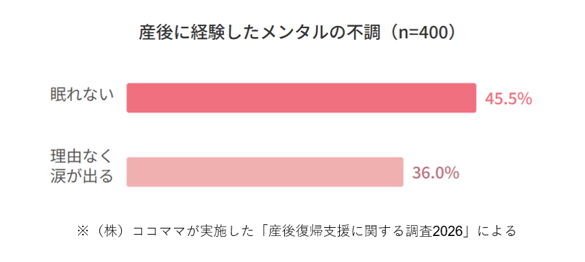 こうした環境の中、産後の精神的負担も深刻です。産後の女性の45.5%が「眠れない」、36.0%が