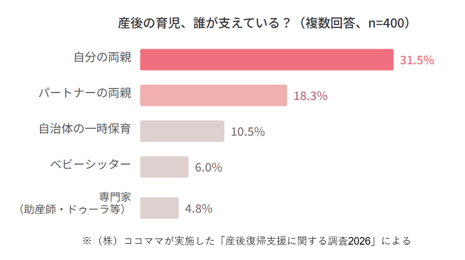 特に、育児支援の担い手を見ると、「自分の両親」など血縁に依存する割合が約5割に上る一方、助産師・産後ドゥーラなど外部専門家の利用はわずか4.8%にとどまっています。「頼れる家族が近くにいない」家庭では、孤立がさらに深刻になります。