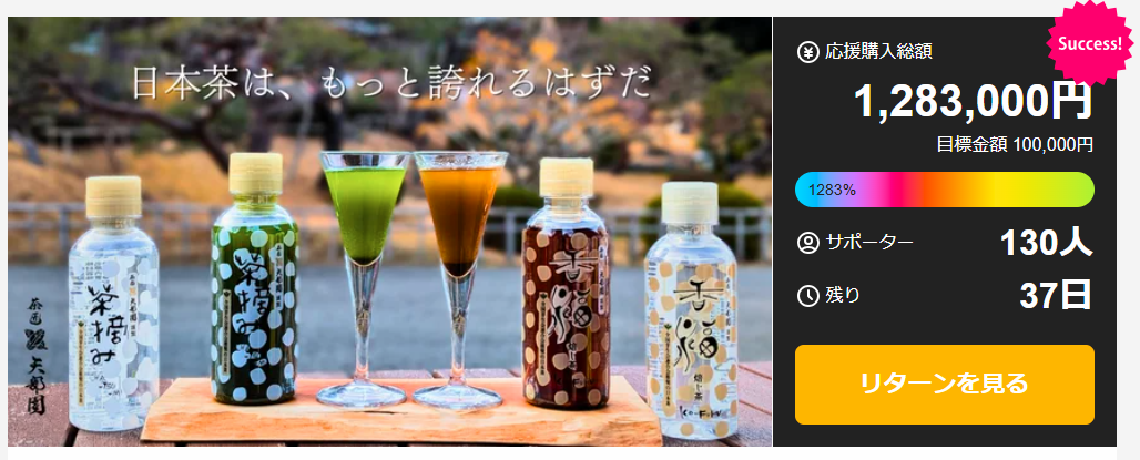 【宮城県塩竈市/2026年4月17日】 創業九十余年の歴史を持つ株式会社矢部園茶舗(所在地:宮城県塩竈市、代表取締役:矢部 亨)は、2026年4月17日(金)10時より、応援購入サービス「Makuake」にて、日本茶ボトル『茶摘み(ちゃつみ)』および新ラインナップ『ほうじ茶 香福(こうふく)』の先行販売を開始いたしました。 プロジェクト開始直後から大きな反響を呼び、開始9分で目標金額を達成、4月23日10時時点で1283%を達成したことをお知らせいたします。