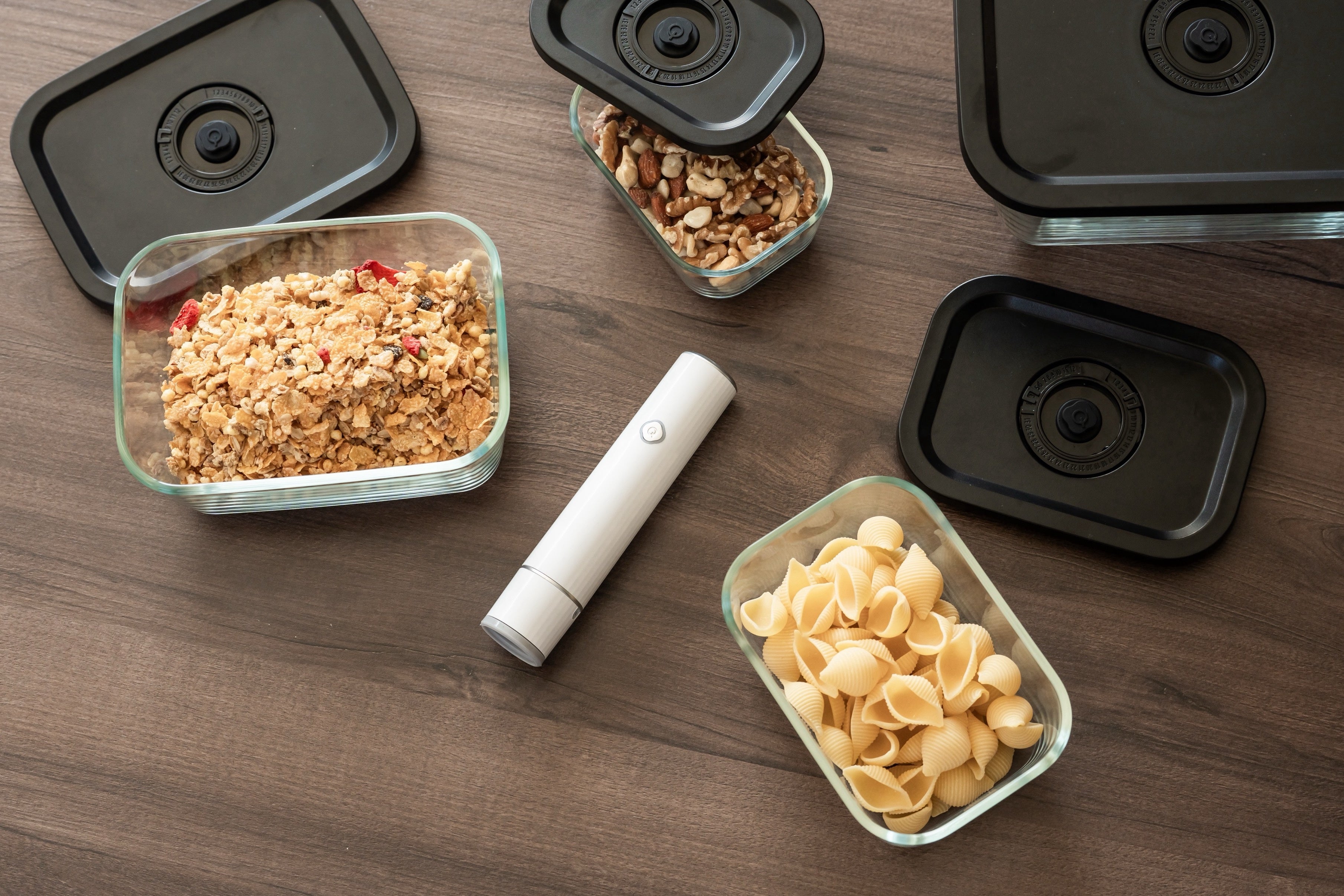 蓋の上から「STOQ Slim Pump」のボタンを押すだけ。約10秒で自動的に真空引きが完了し、真空検知機能により自動停止します。容器内の酸素を抜くことで酸化と菌の繁殖を抑え、食材の鮮度を長くキープします。